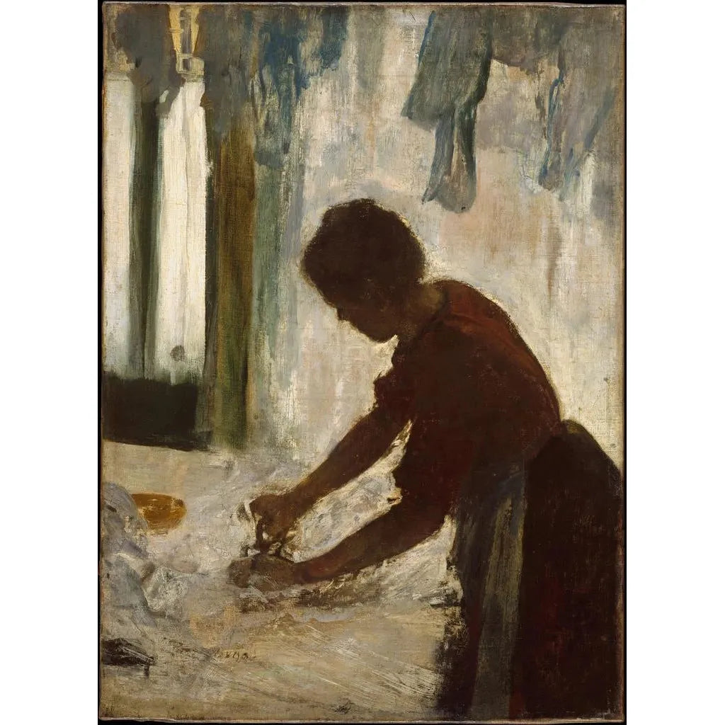 I "En kvinde stryger" fanger Edgar Degas et intimt øjeblik af husholdningslivet med en slående finesse. Kompositionen af kunstværket fremhæver den kvindelige figur, fokuseret på sin opgave, mens bløde farver og lyslege skaber en varm atmosfære. Degas' teknik, der kombinerer pastel og olie, giver liv til teksturen af tøjet og det lys, der filtreres gennem rummet. Dette kunstværk fremkalder en elegant enkelhed, der afslører skønheden i daglige gestus og familiens intimitet.