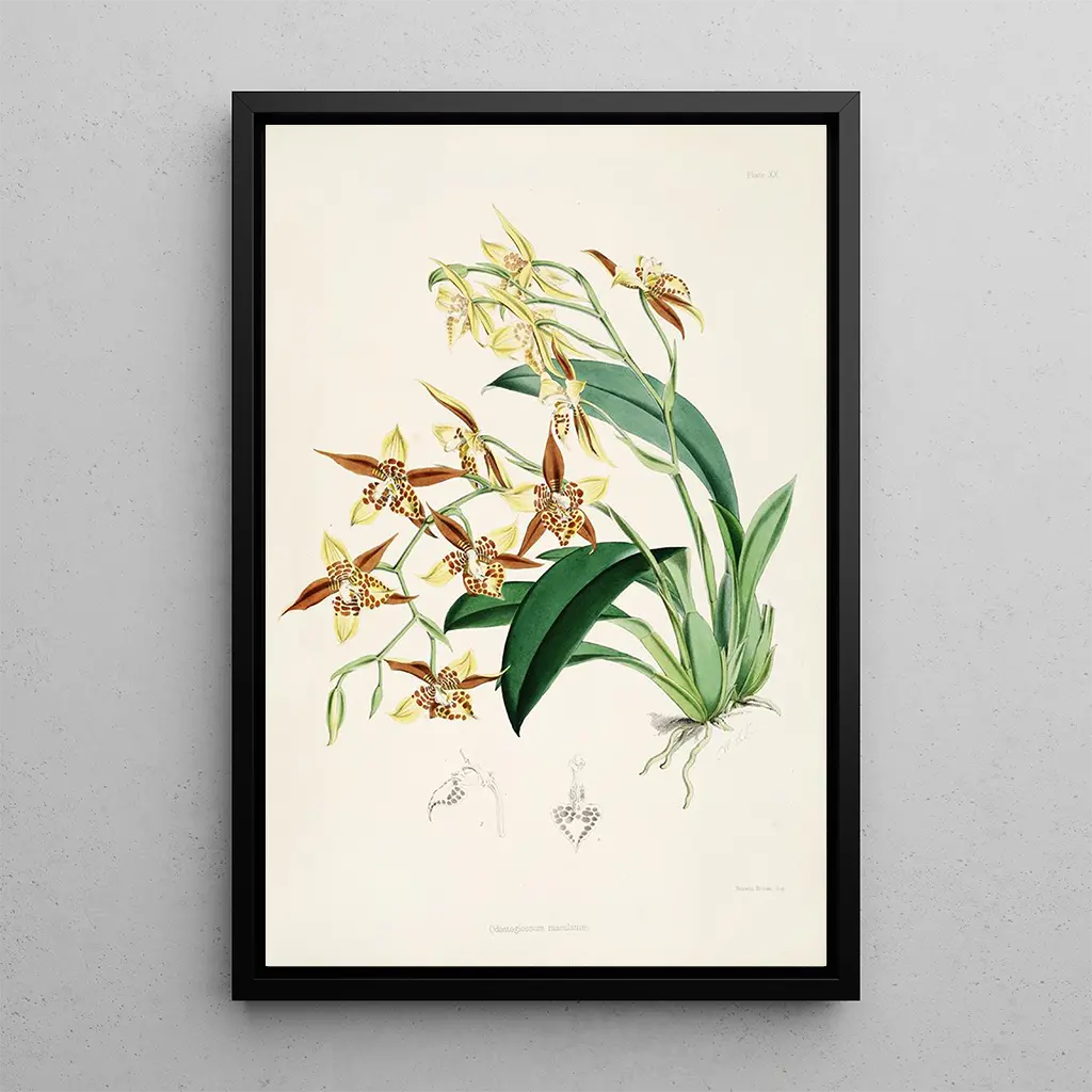 Kunsttrykket af Odontoglossum Pl19 er en sand hyldest til skønheden i orkidéerne. Dette maleri, rigt på detaljer, fanger blomstens elegance med en palette af livlige farver, der spænder fra strålende gult til dyb violet. Akvarelteknikken, mestret af kunstneren, giver mulighed for at gengive blødheden i kronbladene og kompleksiteten af formerne. Atmosfæren, der udspringer af dette værk, er både beroligende og inspirerende, og inviterer betragteren til at dykke ned i en verden, hvor naturen er dronning. Hvert penselstrøg synes at fortælle en historie, nemlig om den flygtige skønhed af blomsterne.