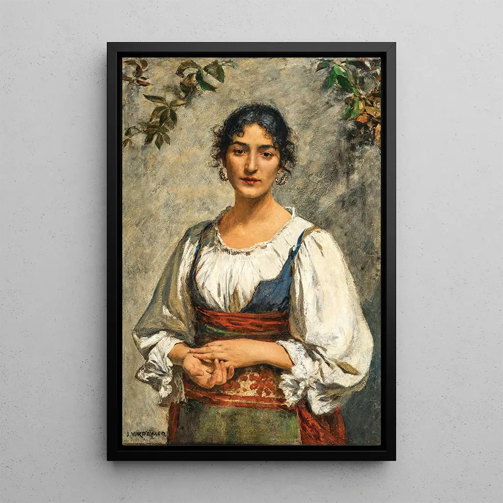 Kunsttrykket "En kvinde sicilianer" af Johann Victor Krämer fremkalder en tidløs skønhed, der fanger essensen af en kvinde med et dybt blik og en delikat udtryksfuldhed. De varme farver, der blander jord- og lysnuancer, skaber en atmosfære, der er både intim og levende. Kunstnerens teknik, kendetegnet ved en slående realisme, giver liv til hver eneste detalje, fra teksturerne i tøjet til reflekserne i øjnene. Dette kunsttryk inviterer til en stilfærdig eftertanke, hvor man næsten kan høre hvisken fra historien om denne kvinde, symbol på en rig og kompleks kultur.