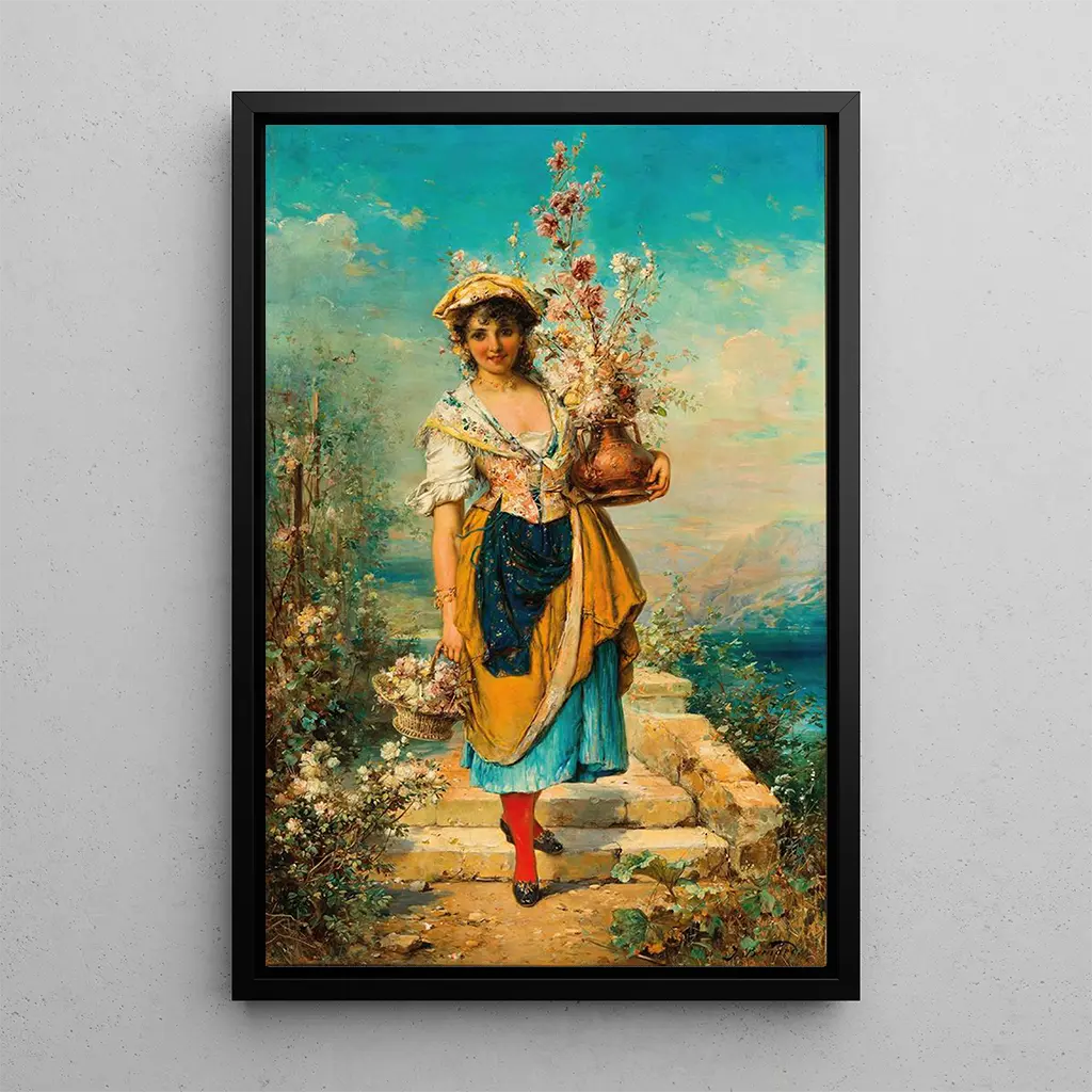 En smuk blomsterhandler: et glimt af farve og liv. "En smuk blomsterhandler" er et levende kunsttryk, der fejrer naturens skønhed gennem en blomsterbuket fyldt med farver. Den dynamiske komposition, hvor blomsterne næsten synes at danse under lyset, fremkalder en glad og livlig atmosfære. De rige nuancer af rød, gul og violet blander sig harmonisk, tiltrækker opmærksomhed og vækker sanserne. Den fine maleteknik, med præcise penselstrøg, giver liv til hver enkelt blomst og blad, hvilket skaber en følelse af friskhed og vitalitet. Dette lærred er en sand hyldest til naturen, der inviterer til at værdsætte enkelheden og skønheden i blomsterne. Hans Zatzka: en virtuos inden for romantik og kvindelig skønhed. Hans Zatzka, østrigsk maler fra det 19. århundrede, er berømt for sine fremstillinger af kvindelig skønhed og natur. Hans stil, forankret i romantikken, kendetegnes ved rige kompositioner og iøjnefaldende farver. Zatzka blev påvirket af tidens store mestre, men formåede at udvikle sin egen unikke signatur, der kombinerer sensualitet og ynde. Hans værker, ofte fyldt med poesi, fanger øjeblikke af nåde og ro, hvilket gør ham til en uundværlig figur i den romantiske bevægelse. Hans evne til at fremkalde følelser gennem sine motiver gør ham til en ikonisk skikkelse i østrigsk kunst. En dekorativ tilføjelse med mange fordele. Kunsttrykket af "En smuk blomsterhandler" er et perfekt supplement til din indretning. Uanset om det er i stuen, spisestuen eller på kontoret, tilføjer dette lærred et strejf af farve og liv til dit rum. Dets høje kvalitet som kunsttryk sikrer en bemærkelsesværdig trofasthed mod detaljerne, så du kan nyde skønheden af værket i dit eget miljø. Det æstetiske tiltrækningskraft af dette værk gør det til et dekorativt element, der uden tvivl vil tiltrække opmærksomhed og vække følelser, hvilket forvandler dit hjem til et varmt og indbydende sted.