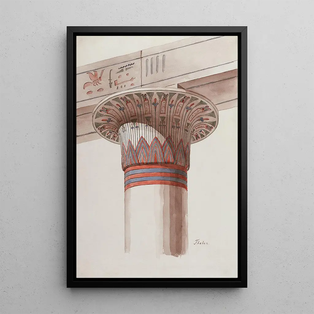 Cette kunsttryk af et chapiteau de Thèbes fremhæver storheden og sofistikeretheden af den ægyptiske arkitektur. Blomstermotiver og elegante linjer vidner om en enestående håndværkskunst, mens de naturlige farver minder om de materialer, der blev brugt i opførelsen af templer. Atmosfæren, der udspringer af dette værk, er fyldt med mysterium og majestæt, og inviterer seeren til at dykke ned i den fascinerende historie om det gamle Egypten. Detaljernes finhed og formernes præcision gør dette lærred til et ægte mesterværk, der fanger essensen af den antikke kunst.