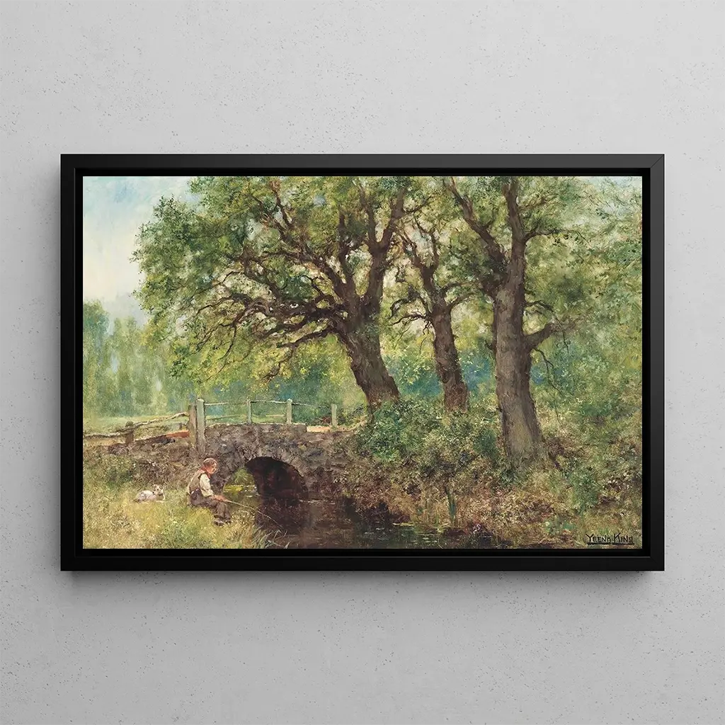 I "Un jeune pêcheur" dykker Henry John Yeend King ned i en fredelig og eftertænksom atmosfære. Lærredet, badet i blid lys, skildrer en ung dreng, der fisker, omgivet af frodig natur. Pastelfarver, der blander nuancer af grøn, blå og guld, skaber en visuel harmoni, der inviterer til drømmende refleksion. Kunstnerens teknik, kendetegnet ved delikate penselstrøg, giver liv til hver detalje, fra refleksioner på vandet til bladene på træerne. Dette maleri fremkalder en tidløs ro, et suspendert øjeblik, hvor naturen og mennesket eksisterer i perfekt symbiose.