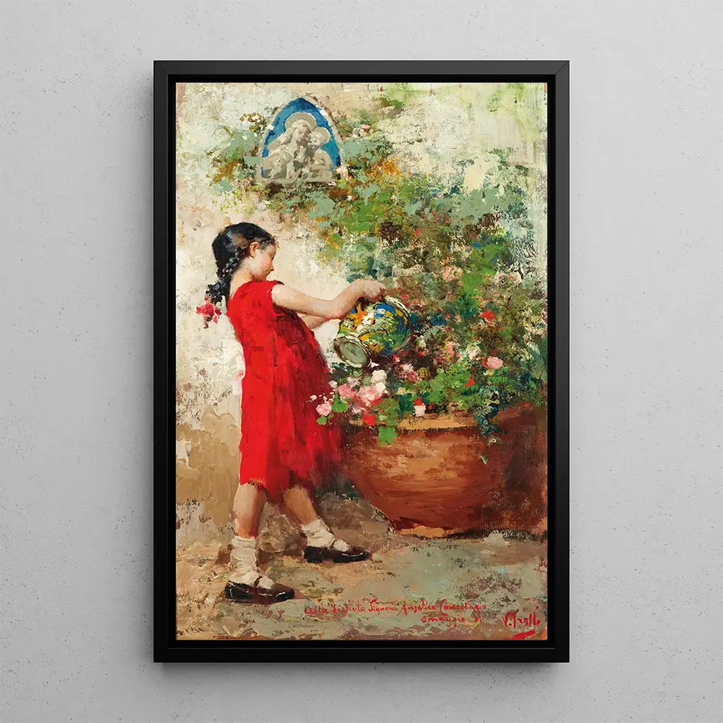 I "En ung pige, der vander blomster" dykker Vincenzo Irolli ned i et øjeblik af ømhed og forbindelse med naturen. Den unge pige, fokuseret på sin opgave, indkapsler blidhed og sindsro, mens de blomstrende blomster omkring hende synes at blomstre under den pleje, hun giver dem. Pastelfarverne og de fine nuancer i værket skaber en fredelig, næsten drømmende atmosfære, der inviterer betragteren til at standse op og værdsætte livets flygtige skønhed. Irolli formår at fange denne harmoni mellem mennesket og dets omgivelser, hvilket gør dette kunsttryk til en ægte hyldest til naturen.