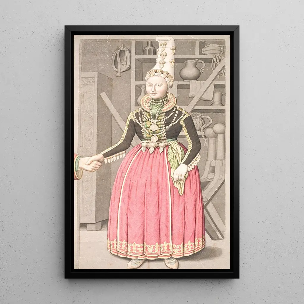 Denne kunsttryk, Une ung pige i brudekjole, fremkalder en atmosfære præget af finesse og ro. Kompositionen fremhæver en ung kvinde klædt i en traditionel dragt, hvis omhyggelige detaljer og pastelfarver skaber en visuelt fængslende harmoni. De bløde nuancer af hvid og rosa, kombineret med grønne indslag, styrker følelsen af friskhed og fornyelse. Maleteknikken, sandsynligvis oljemaling, gør det muligt at gengive teksturerne af stoffet og lysrefleksionerne på en næsten håndgribelig måde, hvilket fordyber betragteren i et øjeblik af ynde og fejring.