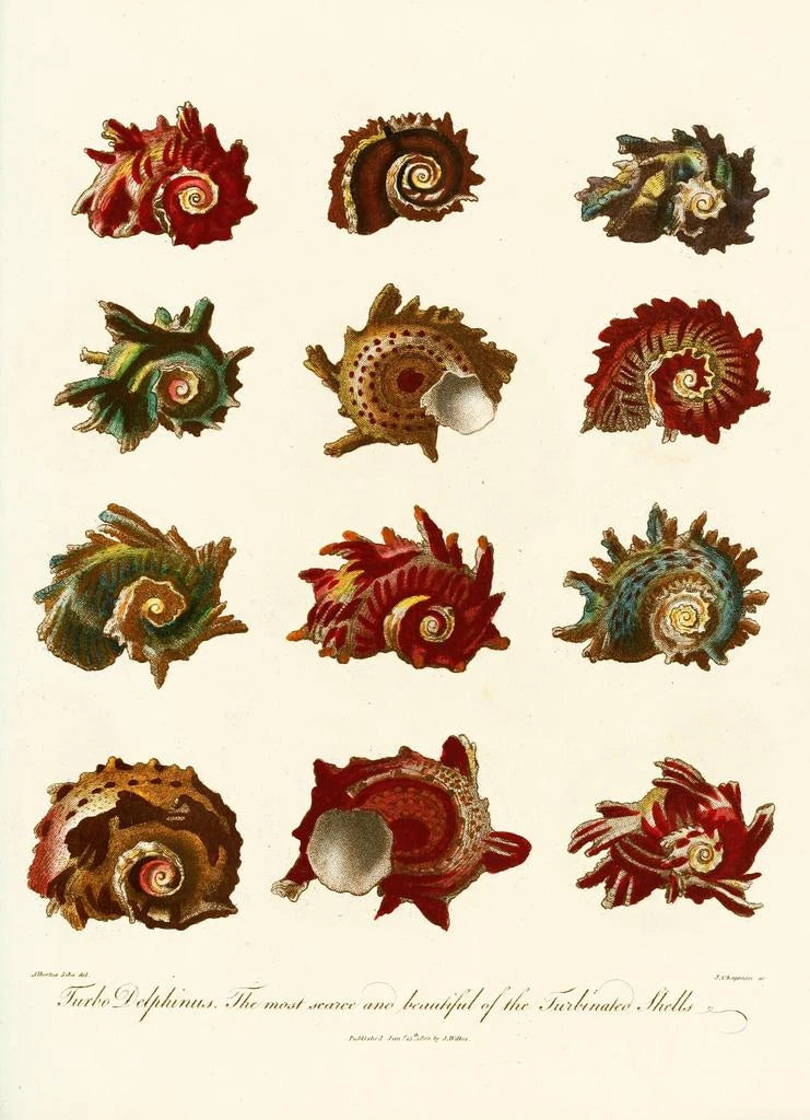 Encyclopaedia londinensis Conchyliologie Pl 10 kunsttryk giver os et fængslende indblik i mangfoldigheden af skaller. De delikate nuancer og de varierede former af de viste eksemplarer fremkalder en rig og fascinerende undervandsverden. Hvert detalje er omhyggeligt gengivet, hvilket skaber en atmosfære, der er både videnskabelig og kunstnerisk. Dette værk inviterer til opdagelse og forundring, og forvandler en naturalistisk undersøgelse til en ægte fejring af naturen.