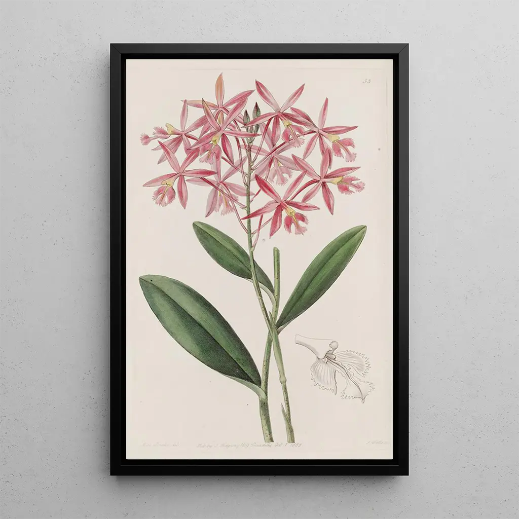 "Epidendrum af M. Schomburgk" af Sydenham Edwards tager os med ind i en frodig verden, hvor naturen udtrykker sig med glans. Denne botaniske illustration, udført med bemærkelsesværdig omhu, fremhæver de fine detaljer i orkidéblomsterne. De levende nuancer af grøn, rosa og gul blander sig harmonisk, hvilket skaber en atmosfære, der er både livlig og beroligende. Akvarelteknikken, anvendt med stor dygtighed, fanger lyset og teksturen af blomsterbladene, hvilket giver en følelse af dybde og realisme. Hvert penselstrøg synes at fortælle historien om denne fascinerende plante og inviterer betragteren til at forundres over naturens skønhed.