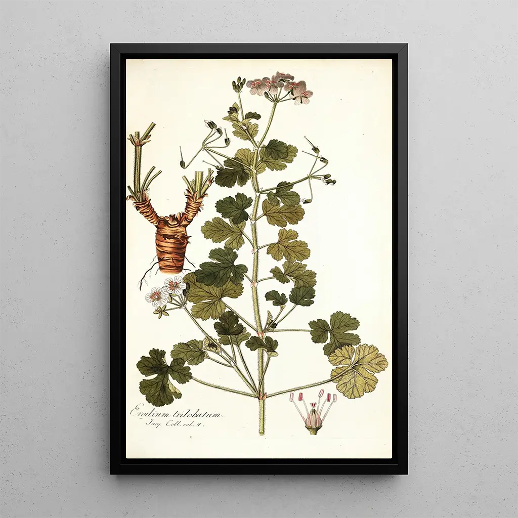 Erodium trilobatum : en hyldest til den blomsterlige delikatesse L'œuvre "Erodium trilobatum" af Nikolaus Joseph Freiherr von Jacquin er en fascinerende fremstilling af denne delikate plante. Med omhyggelige detaljer fanger kunstneren den flygtige skønhed i dens skårne blade og livlige blomster. De bløde nuancer af grønt og rosa blander sig harmonisk, hvilket skaber en beroligende atmosfære. Akvarellens teknik gør det muligt at gengive gennemsigtigheden af blomsterbladene, samtidig med at den tilføjer en lethed til hele værket. Dette kunsttryk inviterer til eftertanke og fremkalder naturens skrøbelighed og den forundring, den vækker. Nikolaus Joseph Freiherr von Jacquin : en pioner inden for botanisk illustration Nikolaus Joseph Freiherr von Jacquin, botaniker og kunstner fra det 18. århundrede, spillede en nøglerolle i den videnskabelige kunstneriske gengivelse af floraen. Hans arbejde er præget af en streng tilgang og en passion for botanik, påvirket af hans rejser i Amerika og Europa. Jacquin har bidraget til viden om eksotiske planter, og hans værker er blevet referencepunkter for botanikerne i hans tid. "Erodium trilobatum" vidner om hans enestående talent og hans engagement i videnskaben, samtidig med at det tilbyder en raffineret æstetik, der fortsat inspirerer. En dekorativ kunstgenstand med mange fordele Kunsttrykket "Erodium trilobatum" er et ideelt dekorativt stykke til forskellige rum, hvad enten det er en stue, et kontor eller et soveværelse. Dets trykkvalitet sikrer en trofast gengivelse af farver og detaljer i det originale værk, hvilket tilføjer et strejf af elegance til dit hjem. Dette kunsttryk, med sin æstetiske appel, skaber en rolig og naturlig atmosfære, der indbyder til afslapning. Ved at vælge dette kunsttryk vælger du et værk, der ikke blot forbedrer din indretning, men også fremkalder skønheden i naturen og Jacquins kunstneriske arv.