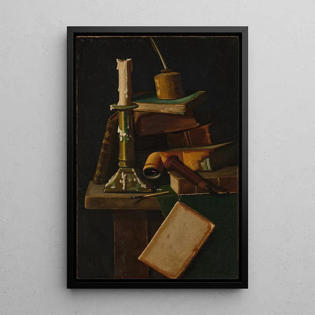La table des érudits, et værk emblematic af John Frederick Peto, fremkalder en verden af eftertanke og viden. I denne komposition blander omhyggeligt placerede genstande, såsom bøger, en fjer og skriveinstrumenter, sig med legende skygger og lys. De varme og jordnære farver, typiske for Peto's stil, skaber en intim og eftertænksom atmosfære. Teknikken med kunsttryk, mestret af kunstneren, giver liv til disse livløse objekter og forvandler dem til stille vidner om ældgammel viden. Hvert detalje, hvert spejlingspunkt inviterer betragteren til at dykke ned i en verden af visdom og nysgerrighed.
