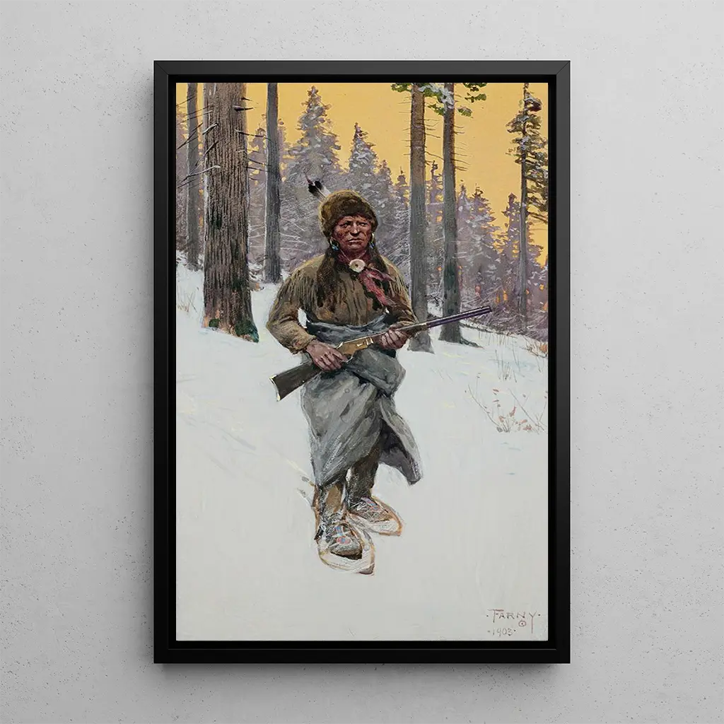I denne kunsttryk af Et øjeblik af spænding fanger Henry Farny intensiteten af en jagtscene midt i de majestætiske landskaber i Nordamerika. De jordfarvede farver, blandet med strejf af blå og grøn, fremkalder den vilde og uberørte natur. Farnys teknik, der kombinerer akvarel og olie, giver liv til hver detalje, fra de koncentrerede udtryk hos jægerne til de flydende bevægelser hos dyrene. Atmosfæren er fyldt med spænding, som om tiden er standset, og inviterer betragteren til at dele dette afgørende øjeblik, hvor overlevelse og naturens skønhed mødes.