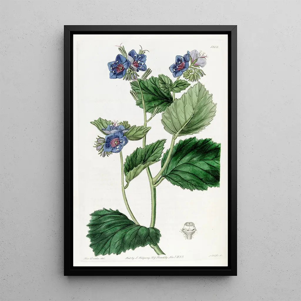 L'Eutoca visqueuse, afbildet med bemærkelsesværdig finesse af Sydenham Edwards, er et kunsttryk, der fejrer plantens skønhed. De omhyggelige detaljer i denne botaniske illustration afslører kompleksiteten af blomsterstrukturen, mens de bløde og naturlige farver fremkalder en følelse af ro. Graveringsteknikken fremhæver teksturer og nuancer, hvilket skaber en beroligende atmosfære. Dette lærred inviterer seeren til at værdsætte naturens subtilitet, samtidig med at det giver en kunstnerisk vision af botanik.