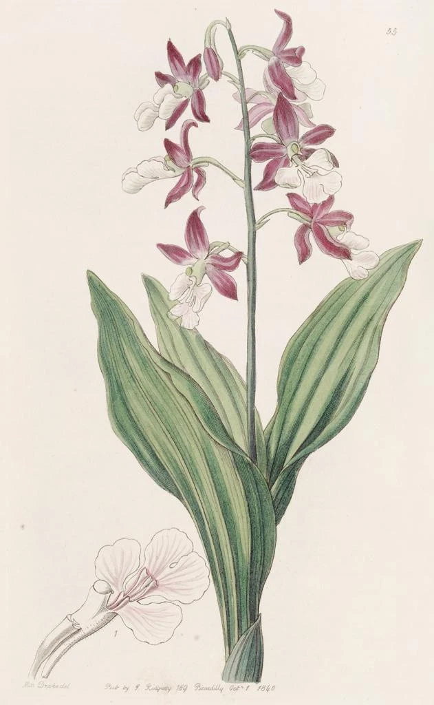 Sydenham Edwards' værk "Fairbloom decoloreret" tager os med på en blomsterverden fyldt med lethed. Pastelfarver, der spænder fra blid rosa til himmelblå, flettes harmonisk sammen og skaber en blid og beroligende atmosfære. Lithografiteknikken, som Edwards mestrer, gør det muligt at fange finheden af blomsterbladene og bladets delikatesse. Hvert detalje er omhyggeligt gengivet, hvilket inviterer betragteren til en opmærksom betragning. Denne kunsttryk afspejler naturens flygtige skønhed, en ægte hyldest til blomstringen.