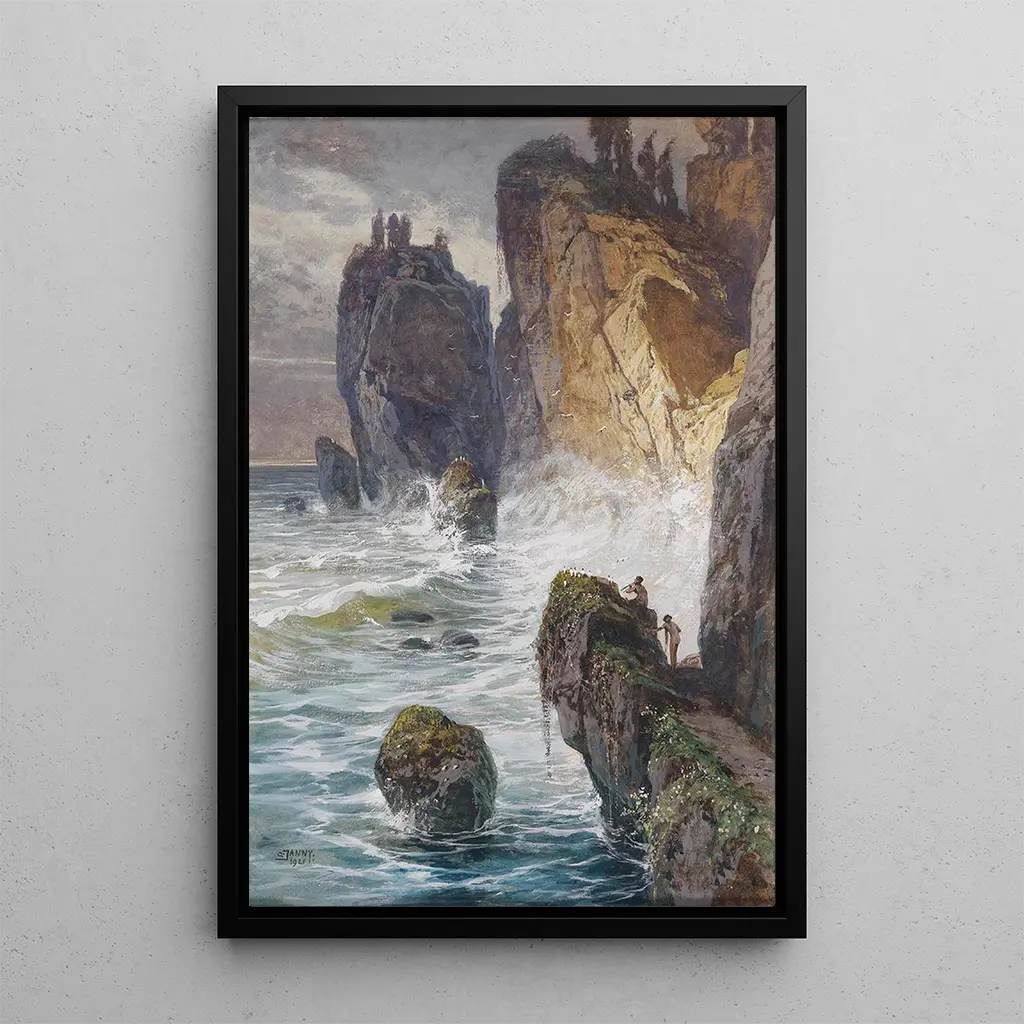 "Faunes sur une côte rocheuse" af Georg Janny er et fængslende kunsttryk, der fremkalder en mytologisk scene, hvor fauner, halvhumanlige væsner, blander sig med den vilde skønhed i naturen. De livlige farver og lysreflekser på klipperne og vandet skaber en levende og dynamisk atmosfære. Kompositionen, rig på detaljer, inviterer betragteren til at udforske samspillet mellem fauner og deres omgivelser, hvilket symboliserer harmonien mellem menneske og natur. Jannys teknik, der kombinerer realisme og impressionistiske strejf, bringer denne fortryllende scene til live, fuld af bevægelse og mysterium.