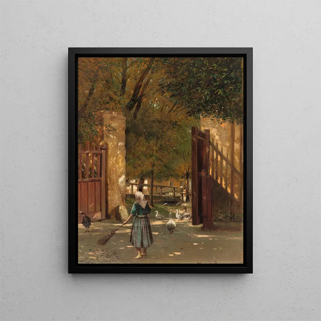 I det fascinerende kunstunivers formår visse værker at fange selve essensen af hverdagen, samtidig med at de tilbyder en uovertruffen følelsesmæssig dybde. "Baljer gården - Eduard Majsch" er et af disse værker, der gennem sin omhyggelige og poetiske gengivelse inviterer betragteren til at beundre skønheden i enkle handlinger. Dette værk, fyldt med lys og bevægelse, fremkalder en scene fra hjemmets liv, hvor det banale forvandles til det sublime og afslører den skjulte magi i daglige pligter. Ved at dykke ned i dette værk transporteres man til et suspendere øjeblik, hvor tiden synes at sænke sig for at give plads til at værdsætte det nuværende øjeblik.