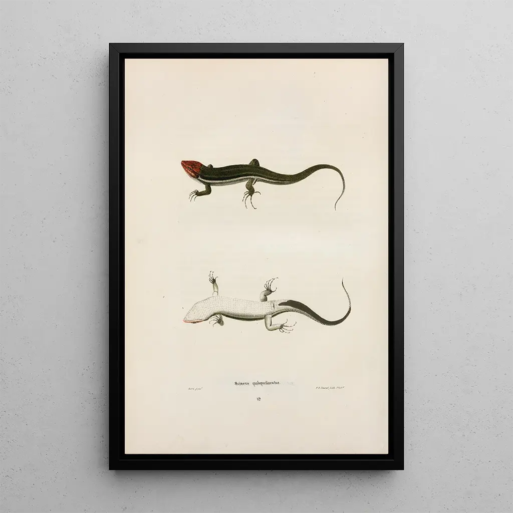 Kunsttrykket "Scinque à cinq lignes" af John Edwards Holbrook indfanger essensen af denne unikke krybdyr med bemærkelsesværdig præcision. Sammensætningen fremhæver de fem karakteristiske linjer, der løber gennem skindet på skinken, hvilket skaber en slående kontrast til de jordnære nuancer i dens omgivelser. Farverne, der spænder fra beige til grøn, er anvendt med en delikathed, der understreger detaljernes finesse. Atmosfæren i værket fremkalder en dyb forbindelse med naturen og inviterer betragteren til at værdsætte skønheden i ofte oversete væsener.