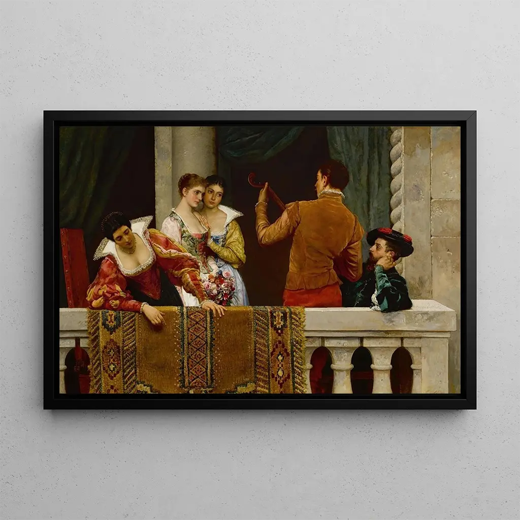I dette livlige værk fanger kunstneren essensen af Venedig, hvor gondoler glider fredeligt gennem de glitrende kanaler. De strålende farver, fra dybblå til flammende rød, skaber en festlig og munter atmosfære. Den anvendte teknik, sandsynligvis olie på lærred, giver en næsten magisk måde at gengive lyset på, hvilket belyser hver detalje i denne livlige scene. Personerne, klædt i traditionelle kostumer, synes at danse til musikkens rytme, hvilket inviterer betragteren til at dykke ned i denne tidløse fest.