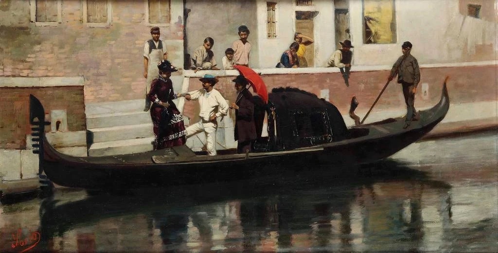 Figuren på gondolen: en scene af venetiansk ro Kunsttrykket af maleriet Figuren på gondolen af Luigi Sorio fremkalder en fredelig atmosfære, hvor den delikate bevægelse af vandet blander sig med den elegante silhuet af en gondol. De bløde pastelfarver, typiske for venetiansk kunst, skaber en visuel harmoni, der inviterer til eftertanke. Lyset spiller en vigtig rolle i dette værk, idet det subtilt oplyser detaljerne i landskabet og personerne, samtidig med at det fremhæver scenens dybde. Sorios teknik, der kombinerer præcision og flydendehed, transporterer os til et suspendert øjeblik, hvor tiden synes at standse ved Venedigs kanaler. Luigi Sorio: en mester i venetiansk maleri Luigi Sorio, aktiv i det 19. århundrede, er kendt for sine poetiske skildringer af dagligdagen i Venedig. Påvirket af de store mestre fra renærsansen, formåede han at fange essensen af denne unikke by gennem sine værker. Sorio udviklede sig i en rig kunstnerisk kontekst, hvor romantikken og impressionismen begyndte at påvirke de traditionelle stilarter. Hans malerier, såsom Figuren på gondolen, vidner om hans evne til at blande den klassiske teknik med moderne elementer, hvilket gør ham til en vigtig kunstner i sin tid, hvis arv stadig værdsættes i nutidens venetianske kunst. En dekorativ erhvervelse med mange fordele Kunsttrykket af Figuren på gondolen er et ideelt dekorativt stykke til at berige dit hjem, uanset om det er i en stue, et kontor eller et soveværelse. Dets trykkvalitet og trofasthed mod det originale værk sikrer en uomtvistelig æstetisk appel. Ved at integrere dette maleri i din indretning tilføjer du et strejf af elegance og ro til dit rum. Den venetianske scene, både tidløs og evocerende, inviterer til flugt og drømmeri, hvilket gør dette kunsttryk til et perfekt valg for dem, der ønsker at skabe en beroligende og inspirerende atmosfære derhjemme.