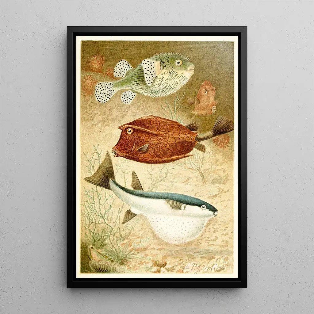 Reproduktionen "Poisson-globe og Poisson-kiste" af Pierre Jacques Smit tager os med til en undervandsverden rig på farver og teksturer. Fisken, med deres karakteristiske former og livlige mønstre, er gengivet med en præcision, der vidner om kunstnerens omhyggelige observationer. Nuancer af blå, gul og orange blander sig for at skabe en levende og dynamisk stemning. Smit's teknik, der kombinerer realisme og impressionistiske strejf, giver liv til denne akvatiske scene og inviterer betragteren til at dykke ned i den mystiske verden af dybhavet.