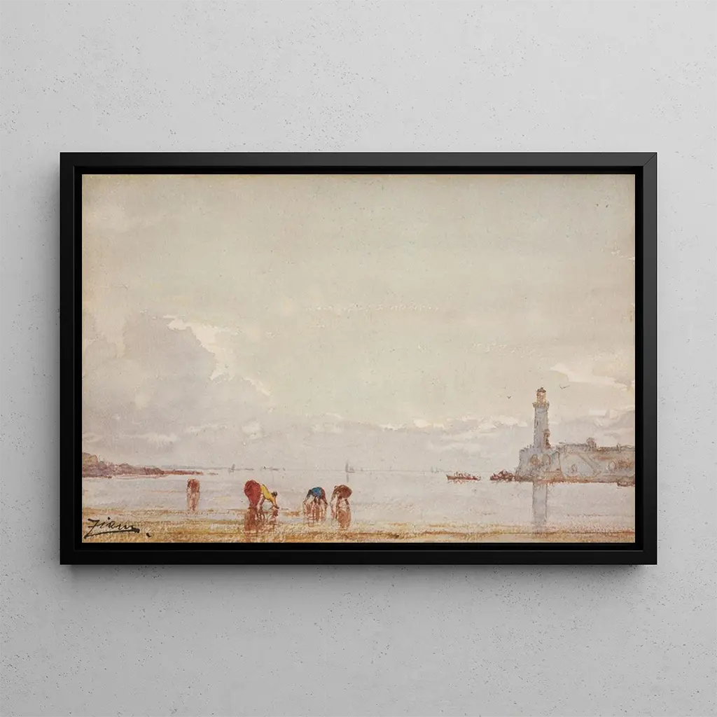 Pêcheurs de coquillages à Antibes : en danse mellem hav og lys I dette livlige værk fanger Félix Ziem essensen af Middelhavet med en palette af strålende farver. Fangerne, delikate silhuetter, synes at danse i takt med bølgerne, mens himlen får nuancer af guld og azur. Ziems teknik, der blander olie og lys, skaber en næsten æterisk atmosfære, hvor hvert penselstrøg fremkalder bevægelsen af vandet og den bløde klima. Kompositionen, afbalanceret mellem jord og hav, inviterer betragteren til at fordybe sig i dette maleri, til at føle den maritime brise og høre bølgernes hvisken. Félix Ziem : en mester i marinelandskabet Félix Ziem, fransk maler fra det XIX. århundrede, er kendt for sine marinelandskaber og sine udsigter over Venedig. Påvirket af den romantiske bevægelse og impressionisterne, har han udviklet en unik stil, der forener realisme og poesi. Hans rejser gennem Europa, især i Italien og Middelhavet, har dybt præget hans værk. Ziem har formået at fange lyset og atmosfæren i de steder, han malede, hvilket gør ham til en forløber for impressionismen. Hans kunstneriske arv består, og hans værker fortsætter med at inspirere kunstelskere og samlere. En dekorativ erhvervelse med mange fordele Kunsttrykket af "Pêcheurs de coquillages à Antibes" er et ideelt valg til at forskønne dit hjem. Uanset om det er i en stue, et kontor eller et soveværelse, tilføjer dette maleri et strejf af ro og flugt. Dets trykkvalitet og trofasthed mod de originale farver sikrer en uomtvistelig æstetisk appel. Ved at vælge dette lærred inviterer du ikke blot et stykke historie ind i dit rum, men også et værk, der fremkalder eftertanke og beundring. Forvandl din indretning med dette centrale stykke, der vækker den tidløse skønhed af havet.