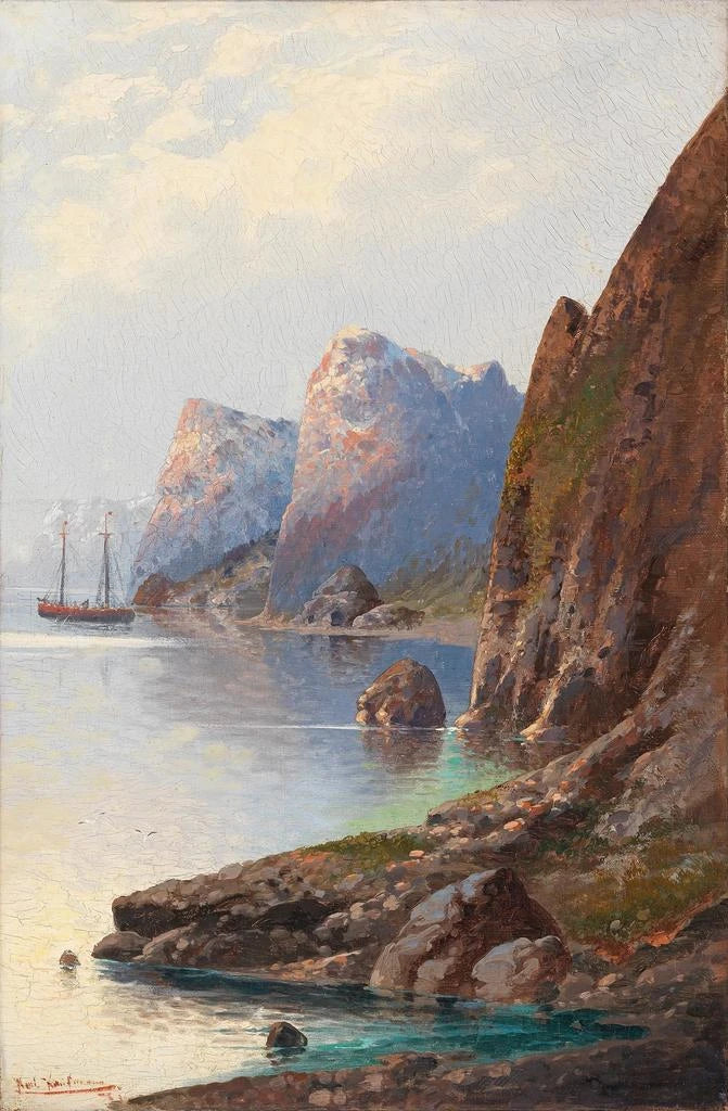 Karl Kaufmann, maler fra begyndelsen af det 20. århundrede, er ofte forbundet med landskabsmaleriets skole, hvor han har formået at gøre sig gældende med sin unikke stil. Hans rejser gennem de skandinaviske fjorde har dybt påvirket hans værk, hvilket har givet ham mulighed for at oversætte den storslåede natur til lærredet. Inspireret af impressionistiske teknikker formår Kaufmann at formidle lyset og atmosfæren i de steder, han skildrer. Fjordlandskabet er et perfekt eksempel på hans talent og vidner om hans engagement i at fejre skønheden i de naturlige omgivelser.