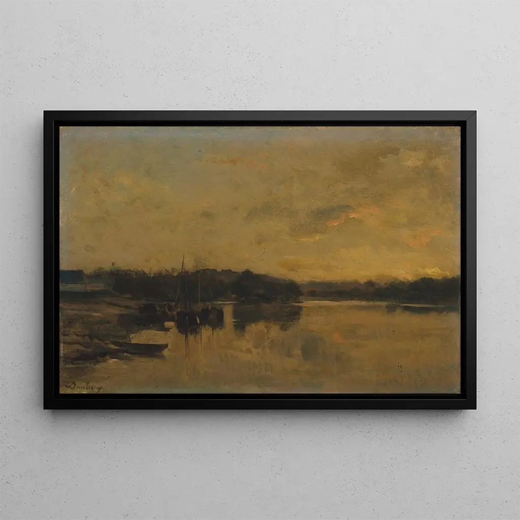 La flod om aftenen af Charles François Daubigny er et kunsttryk, der inviterer til drømmende refleksion. Lærredet, badet i bløde nuancer af blå og orange, fanger magien ved en skumring over vandet. De funklende reflekser danser på flodens overflade, mens skyerne, omhyggeligt malet, synes at svæve i en fredelig himmel. Kompositionen er omhyggeligt afbalanceret, og blander naturlige elementer med en rolig atmosfære. Dette kunsttryk fremkalder en følelse af fred, som om tiden er standset, så seerne kan fordybe sig i dette idylliske landskab.