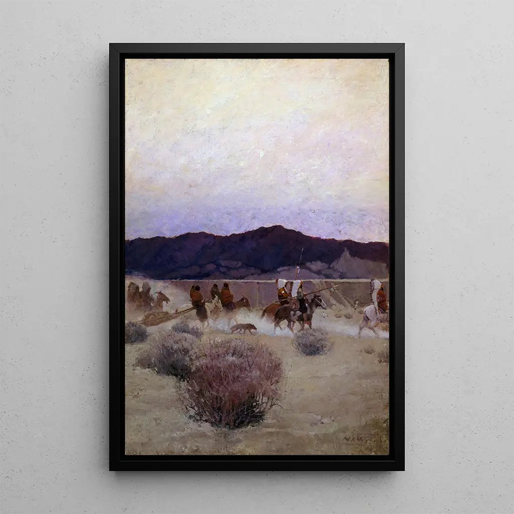 Flytning af lejr: en livssejr i naturen I "Flytning af lejr" fanger N. C. Wyeth essensen af et udendørs eventyr. Lærredet skildrer en gruppe pionerer, der pakker deres ting sammen, omgivet af frodig natur. De varme og jordnære farver fremkalder en atmosfære af kammeratskab og beslutsomhed. Det bløde skumringslys oplyser ansigterne, mens de omhyggelige detaljer i udstyr og tøj vidner om en særlig opmærksomhed på ægthed. Dette kunstværk inviterer betragteren til at føle lugten af den fugtige jord og lyden af blade under fødderne, hvilket skaber en fuldstændig fordybelse i dette overgangsøjeblik. N. C. Wyeth: en mester i amerikansk illustration Født i 1882, er N. C. Wyeth en af de mest indflydelsesrige illustratører fra begyndelsen af det 20. århundrede, kendt for sine værker, der kombinerer kunst og fortælling. Han var stærkt påvirket af de store mestre inden for klassisk maleri, samtidig med at han udviklede en karakteristisk stil, der forener realisme og romantik. Wyeth arbejdede primært inden for bogillustration, men hans lærreder, som "Flytning af lejr", vidner om hans talent for at fange visuelle fortællinger. Hans arbejde markerede en tid, hvor illustration var et kraftfuldt kommunikationsmiddel, og han var med til at forme den amerikanske kollektive fantasi. En dekorativ kunsttryk med mange fordele Kunsttrykket af "Flytning af lejr" udgør et centralt element i ethvert interiør, uanset om det er i en stue, et kontor eller et soveværelse. Dets trykkvalitet sikrer en trofast gengivelse af farver og detaljer i det originale værk, hvilket tilføjer et strejf af ægthed til din indretning. Dette lærred fremkalder temaer som eventyr og natur, og skaber en varm og indbydende atmosfære. Ved at integrere dette kunsttryk i dit rum inviterer du ikke blot kunsten ind i din hverdag, men også en rig historie, der vil fange dine gæster og berige dit miljø.