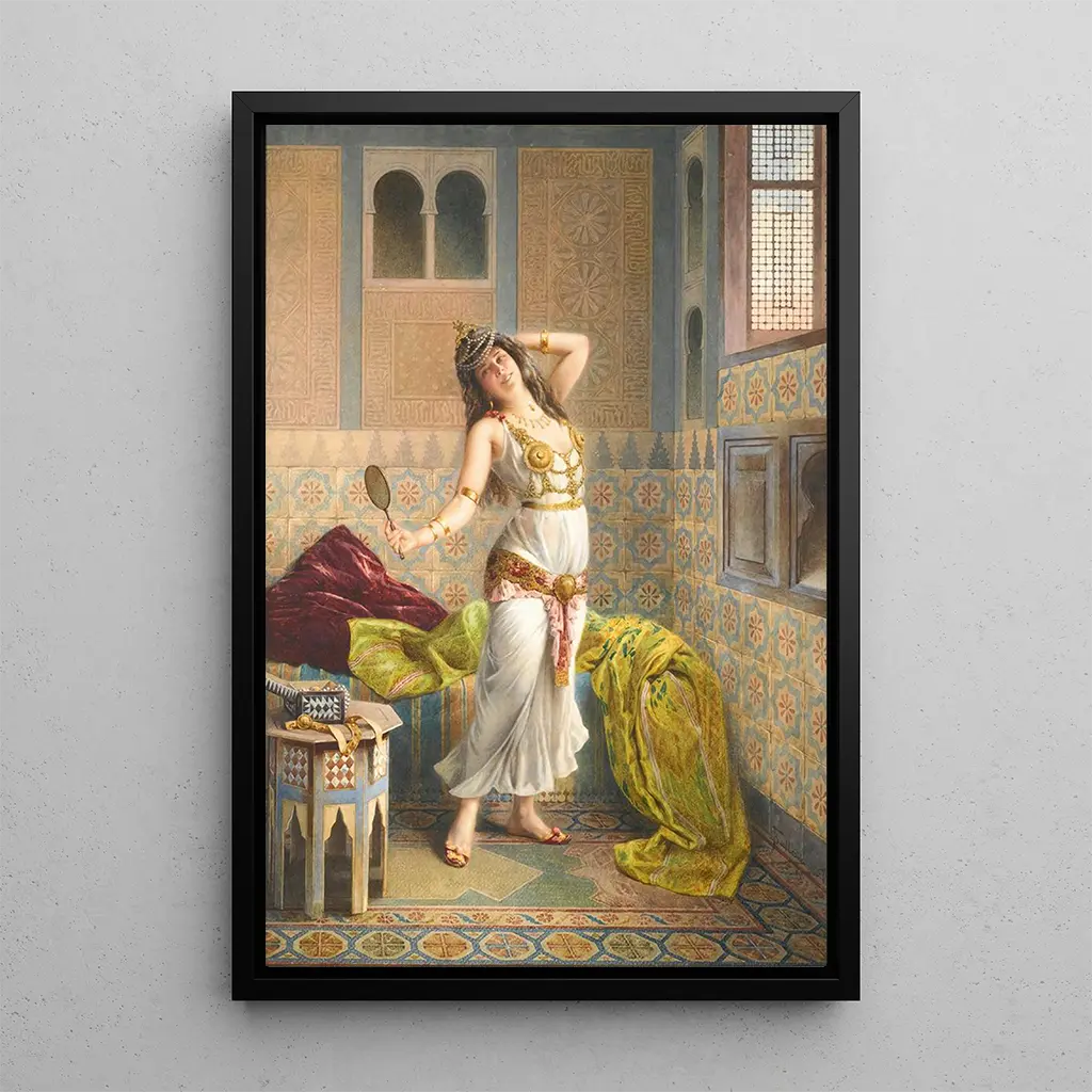 I Forberedelse til dans fanger Francesco Ballesio essensen af ynde og bevægelse. Dette livlige kunsttryk viser kvindelige figurer i fuld forberedelse, deres holdninger og udtryk antyder en glædelig forventning. Pastelfarverne og de fine detaljer i kostumerne tilføjer en lethed og dynamik til scenen. Ballesios teknik, der kombinerer realisme og elegance, gør det muligt at føle den energi og de følelser, der udspringer af dette flygtige øjeblik, og forvandler en simpel forberedelse til en ægte fejring af dansen.