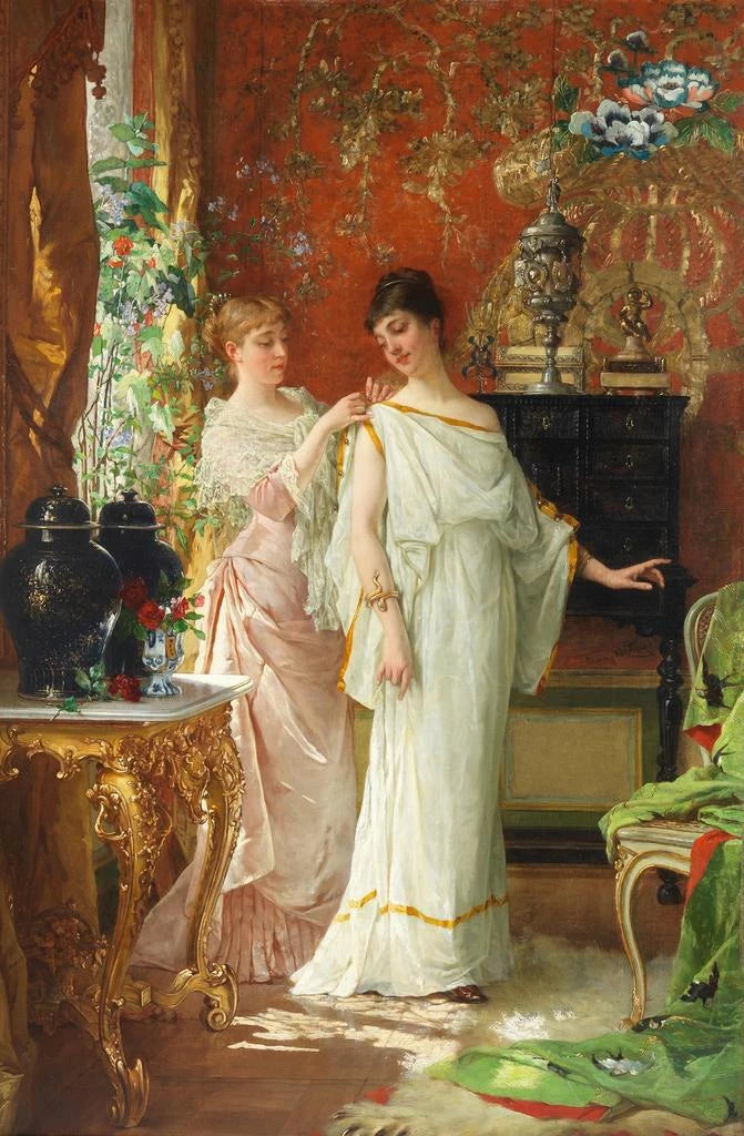 Kunsttrykket af "Forberedelser" er et dekorativt stykke, der vil berige ethvert rum, uanset om det er en stue, et kontor eller et soveværelse. Dens kvalitet som kunsttryk garanterer en bemærkelsesværdig trofasthed over for farver og detaljer i det originale værk, hvilket tilføjer et strejf af elegance og ro til dit hjem. Med sin æstetiske appel inviterer dette billede til eftertanke og drømmeri, og skaber en varm og indbydende atmosfære. Ved at vælge dette lærred vælger du et kunsttryk, der ikke blot forskønner, men også fortæller en historie, nemlig et øjeblik fanget i tiden.