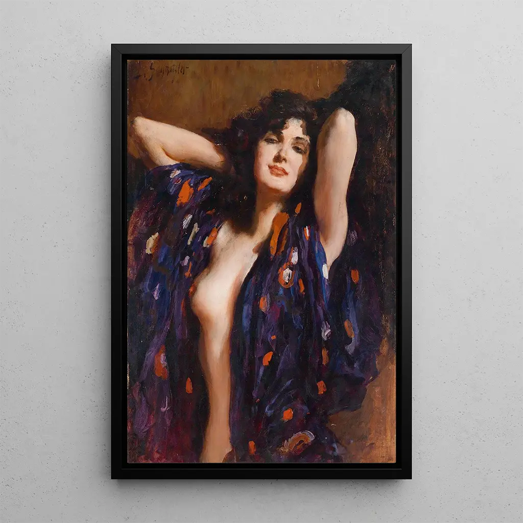 Kunsttrykket af "Forførende blik" er et dekorativt stykke, der vil berige dit hjem, uanset om det er i en stue, et kontor eller et soveværelse. Dets trykkvalitet garanterer en trofast gengivelse af farver og detaljer i det originale værk, hvilket giver dig mulighed for at nyde dets æstetiske appel fuldt ud. Dette kunsttryk tiltrækker opmærksomhed og vækker samtaler, hvilket tilføjer et strejf af elegance og charme til din indretning. Ved at vælge dette lærred, vælger du et værk, der ikke blot forbedrer dit rum, men også fortæller en historie, nemlig en tidløs skønhed fanget af en talentfuld kunstner.