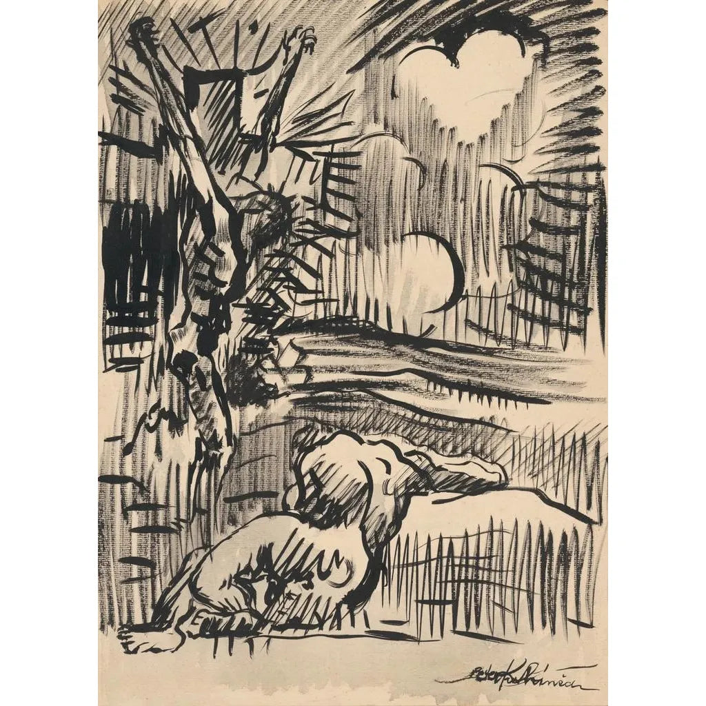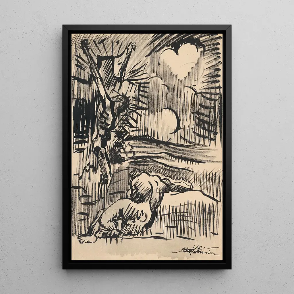 I dette rørende værk, Allongé foran korsfæstelsen, dykker Arnold Peter Weisz-Kubínčan ned i en atmosfære af dyb åndelig refleksion. Kompositionen, centreret om den liggende figur, er fremhævet af mørke farver, hvilket skaber en slående kontrast til det lys, der udspringer fra korsfæstelsen. Kunstnerens teknik, der kombinerer realisme og ekspressionisme, styrker den følelsesmæssige intensitet i scenen. Hvert detalje, fra folderne i klædet til ansigtsudtrykkene, inviterer til en stilfærdig eftertanke, hvor lidelse og forløsning mødes.