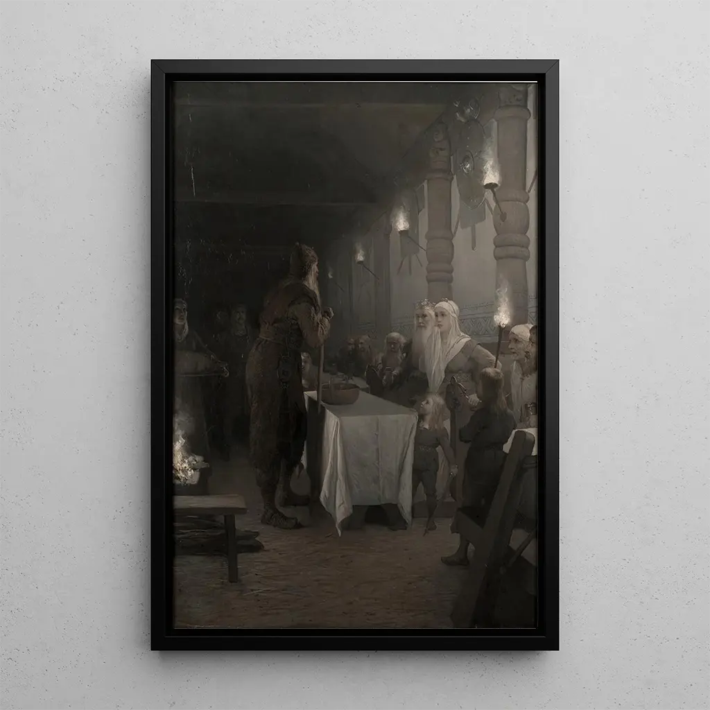 Frithiof tager hjem til kong Ring: en episk rejse ind i de nordiske legender Kunsttrykket af "Frithiof tager hjem til kong Ring" af August Malmström tager os med på en mytisk rejse, hvor heltemod og skønhed mødes. Dette lærred, rigt på detaljer, skildrer Frithiof, en vikingehøvding, i et øjeblik af dramatisk spænding. De livlige farver og nuancer af grøn og blå fremkalder de skandinaviske landskaber, mens Malmströms teknik, både realistisk og romantisk, skaber en fængslende atmosfære. Udtrykkene hos figurerne og de naturlige elementer omkring dem tilføjer en narrativ dybde, der inviterer seeren til at dykke ned i denne ældgamle legende. August Malmström: en mester i svensk romantik August Malmström, født i 1829, er en ikonisk svensk maler inden for romantikkens bevægelse. Inspireret af nordiske fortællinger og legender har han formået at fange essensen af den skandinaviske kultur gennem sine værker. Hans karriere strakte sig over det 19. århundrede, en periode præget af fornyet interesse for folklore og nationalhistorie i Sverige. Malmström var også en indflydelsesrig lærer, der delte sin passion for kunst med mange elever. Hans malerier, såsom "Frithiof tager hjem til kong Ring", er ikke blot visuelle repræsentationer, men også fortællinger, der vækker stolthed og kulturel identitet i hans land. En dekorativ kunsttryk med mange fordele Kunsttrykket af "Frithiof tager hjem til kong Ring" er et dekorativt stykke, der vil berige ethvert interiør, uanset om det er i en stue, et kontor eller et soveværelse. Dets trykkvalitet sikrer en bemærkelsesværdig trofasthed over for detaljerne i det originale værk, hvilket gør det muligt fuldt ud at værdsætte Malmströms talent. Det æstetiske tiltrækningskraft ved dette lærred ligger i dets evne til at fremkalde følelser og fortælle en historie, hvilket gør det til et fremragende valg for dem, der ønsker at tilføje et strejf af elegance og kultur til deres opholdsrum. Ved at vælge dette kunsttryk inviterer du en del af den svenske kunstneriske arv ind i din dagligdag.