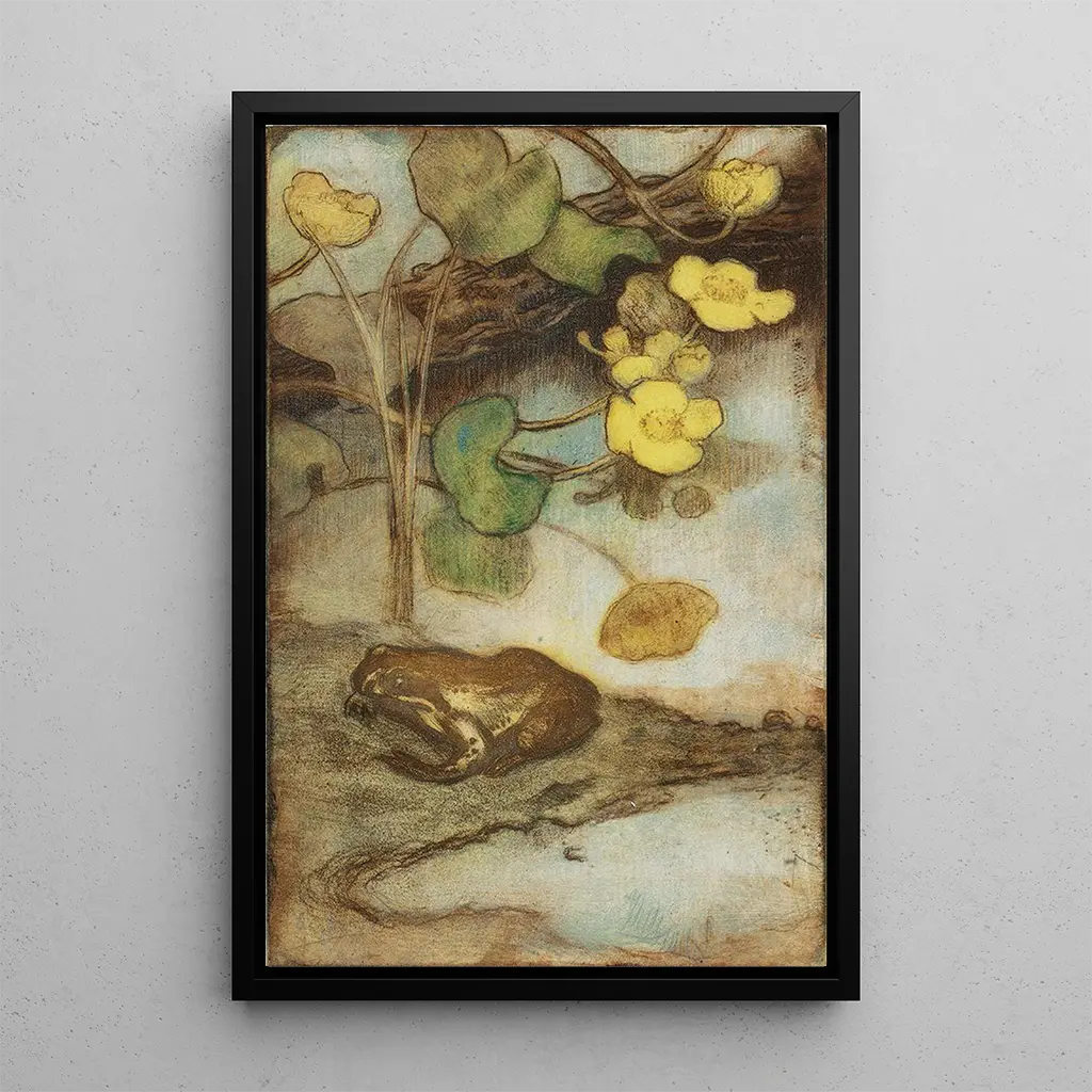 Kunsttrykket af "Grenouille med vandkilde" af Eero Järnefelt tager os med ind i en fredelig og eftertænksom scene. Lærredet, rigt på detaljer, skildrer en grenouille forsigtigt placeret på et blad, omgivet af nuancer af grønt og blåt, der fremkalder friskheden af en morgen ved vandet. Lys- og skyggelege samt præcisionen i stregerne giver værket en rolig og næsten magisk atmosfære. Järnefelt, med sin impressionistiske teknik, formår at fange naturens essens og inviterer os til at værdsætte skønheden i livets små øjeblikke.