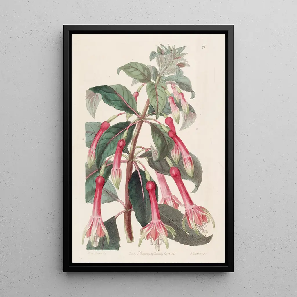 Kunsttrykket Fuchsia med takkede blade tager os med ind i en blomsterverden, hvor de strålende nuancer af rosa og lilla smelter harmonisk sammen. De delikate blomster, hængende som lanterner, tiltrækker opmærksomhed og inviterer til forundring. Akvarelteknikken, anvendt af Sydenham Edwards, gør det muligt at fange letheden af blomsterbladene, samtidig med at der skabes dybde i de takkede blade, der omgiver dem. Atmosfæren, der udspringer af dette kunstværk, er både glædesfyldt og beroligende, og den fremkalder en frodig have, hvor naturen blomstrer.