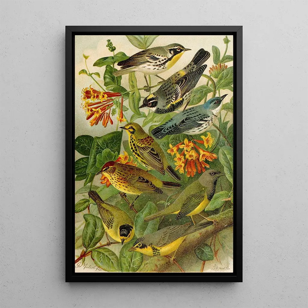 Kunsttrykket af maleriet "Verdens nordamerikanske fugle pl14" af Gustav Mützel tager os med ind i en verden, hvor fuglefaunen blomstrer i al sin pragt. Fuglene, omhyggeligt gengivet, smelter sammen med en rig og varieret naturlig baggrund. De livlige farver og de minutøse detaljer vidner om kunstnerens talent til at fange essensen af disse væsener. Lyset spiller en vigtig rolle i dette værk, idet det oplyser fjerdragten og bladene med en blidhed, der inviterer til eftertanke. Dette lærred er meget mere end blot en gengivelse; det er en hyldest til naturens skønhed.