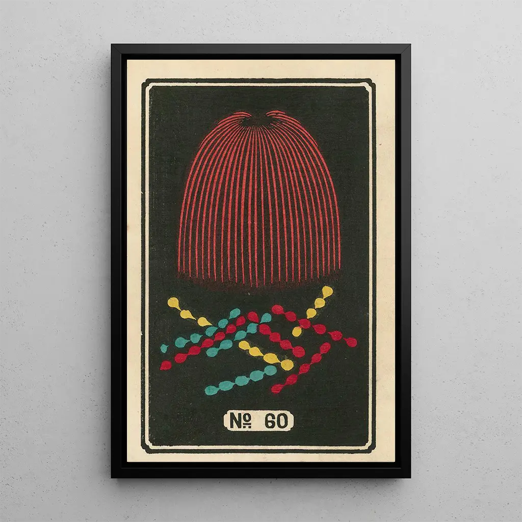 I "Feux d'artifice nocturnes n° 60" giver Jinta Hirayama os et blændende show, hvor de prangende farver af kunsttryk snor sig i en nattehimmel. De livlige nuancer af rød, blå og guld skaber en festlig, næsten drømmende atmosfære, der transporterer betragteren til et øjeblik af fejring. Den fine akvarelteknik formidler letheden af de lysende glimt, mens de organiske former antyder bevægelse og glæde. Hvert detalje er omhyggeligt tænkt for at fange den flygtige essens af disse magiske øjeblikke, og inviterer til eftertanke og forundring.