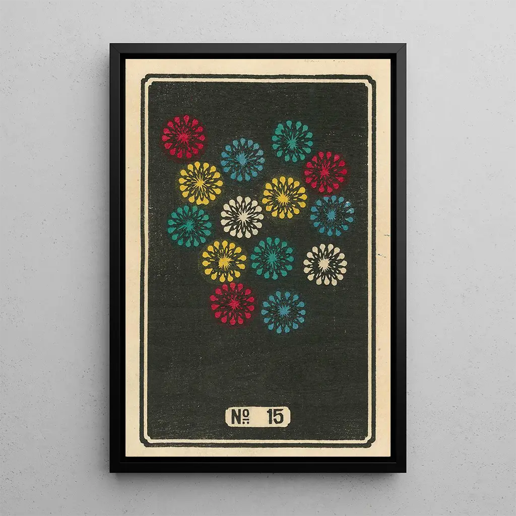 I denne kunsttryk af værket "Feux d'artifice nocturnes n° 15" tager Jinta Hirayama os med på et visuelt betagende show. De prangende farver, fra livlige røde til dybe blå, blander sig harmonisk for at skabe en festlig og drømmende atmosfære. Akvarelteknikken, anvendt med finesse, giver liv til hver eksplosion af lys og fremkalder magien ved en stjerneklar nat. De fine, flydende penselstrøg synes at fange bevægelsen af kunstværket, mens den mørke baggrund fremhæver farvernes glans og inviterer os til at beundre dette værk som et øjebliks ophold i tiden.