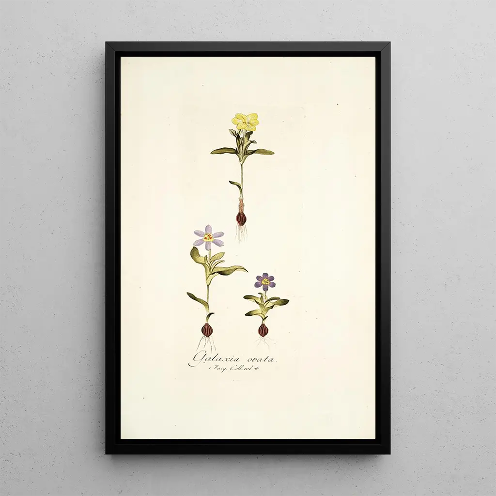 Kunsttrykket af Galaxia ovata fordyber os i en fascinerende botanisk verden, hvor nuancer af grøn og blå smelter harmonisk sammen. De delikate blade, med afrundede konturer, synes at udfolde sig yndefuldt, hvilket fremkalder en næsten luftige lethed. Akvarelteknikken, mestret af Nikolaus Joseph Freiherr von Jacquin, tilbyder en gennemsigtighed, der giver liv til hver detalje og hylder naturens skønhed. Atmosfæren, der udspringer af dette værk, inviterer til fordybelse, som om hvert penselstrøg fortæller en historie om vækst og blomstring.