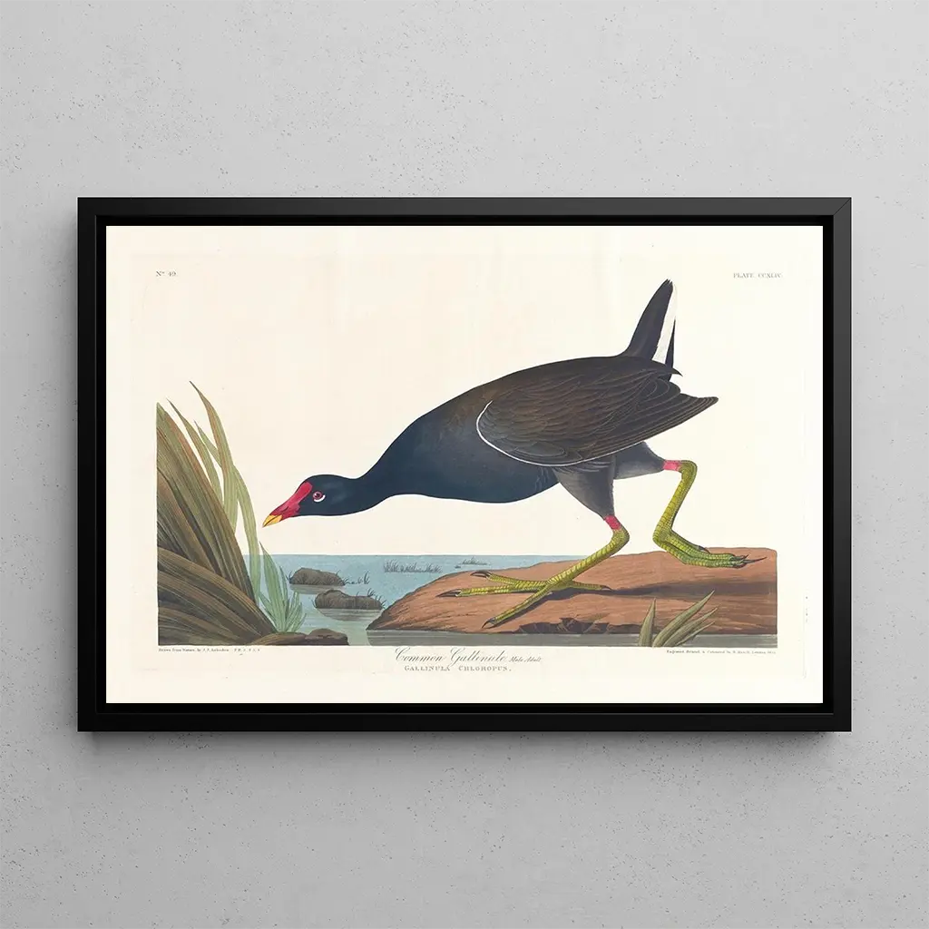Kunsttrykket af Gallinule poule-d'eau mâle adulte dykker ned i en verden fyldt med livlige farver og detaljer. Audubons værk fanger skønheden i denne vandfugl med sit rigt farvede fjerdragt og sine delikate træk. Nuancer af grøn, blå og rød blandes harmonisk, hvilket skaber en levende og dynamisk atmosfære. Akvarelteknikken, kombineret med en omhyggelig tegning, hylder denne fugls ynde, samtidig med at den fremkalder roen i de naturlige omgivelser, den lever i. Dette værk er en ægte invitation til at blive betaget af den vilde fauna.