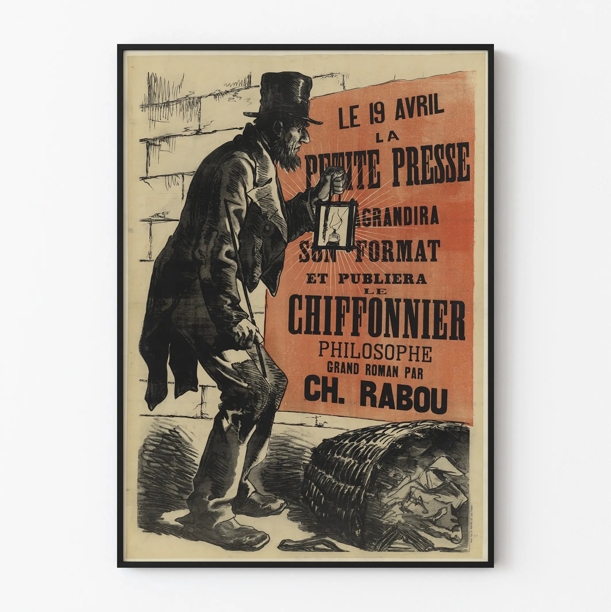 Opdag dette gamle plakát, der forestiller en fængslende scene i gravure-stil, med en mand i høj hat, der holder en lanterne. Denne mand synes at repræsentere en skraldemand, stående ved siden af en væltet kurv fyldt med stykker. I baggrunden bærer en skinnende rød plakat en sort skrift med annoncen "La Petite Presse", der meddeler udvidelse og udgivelsen af romanen "Den Filosoferende Skraldemand" af Ch. Rabou. Dette vintage plakát er et perfekt eksempel på vægdekoration med historisk og litterært tema, ideelt for entusiaster af gamle aviser eller for dem, der ønsker at tilføje et strejf af autenticitet og nostalgi til deres indretning. Det grafiske design i sort-hvid med en farvet baggrund skaber en stærk visuel kontrast, der straks fanger opmærksomheden. Dette plakát er ideelt til at pryde en stue, et bibliotek eller et kontor med et kulturelt og retro præg. Kompositionen fremhæver vigtigheden af titlerne med en kraftfuld og slagkraftig typografi, samtidig med at den inkluderer en ikonisk figur, hvilket gør det til et dekorativt element, der er både æstetisk og meningsfuldt. Et vægdekorationselement, perfekt for dem, der elsker historiske illustrationer og plakater med budskab.