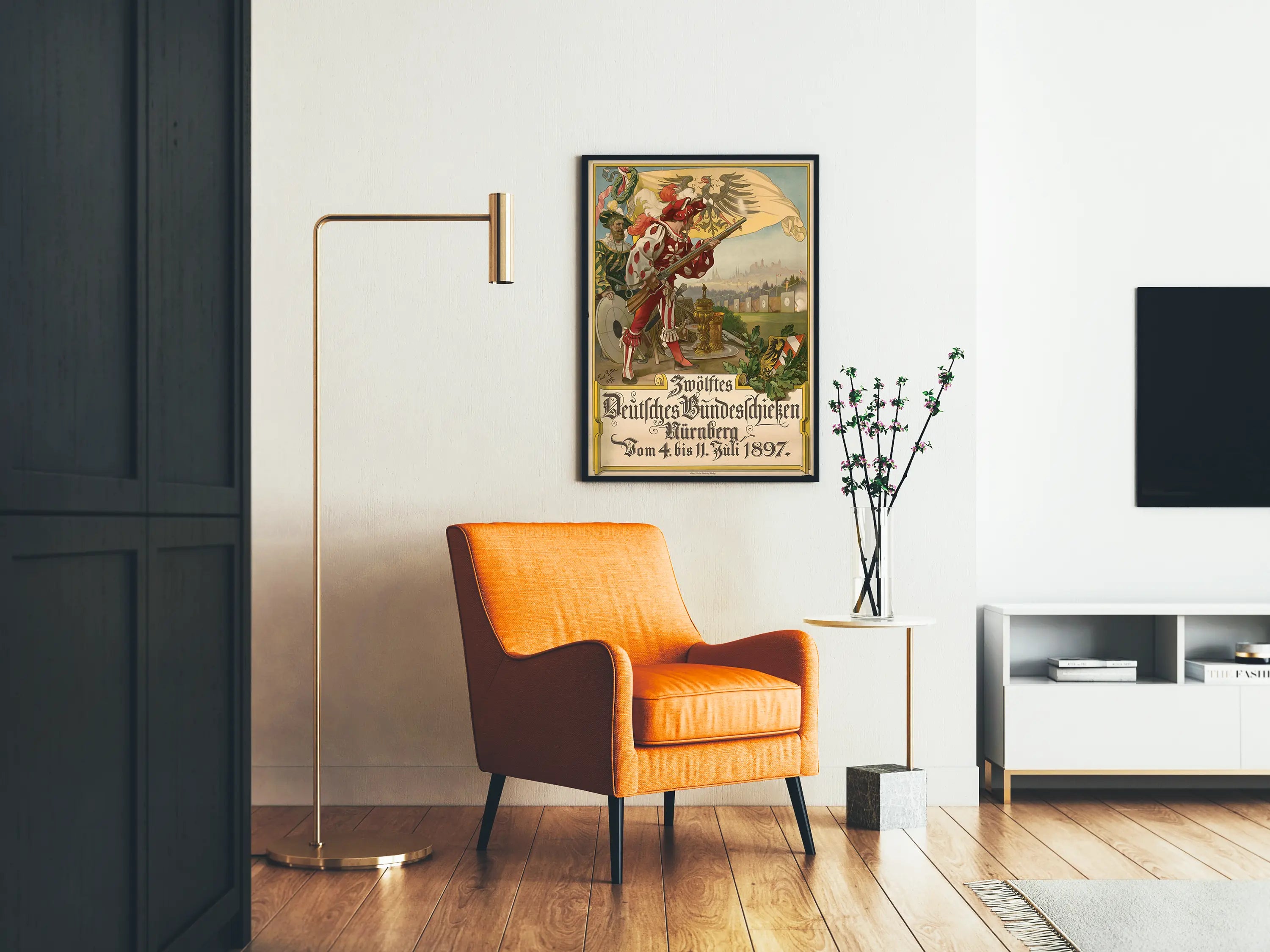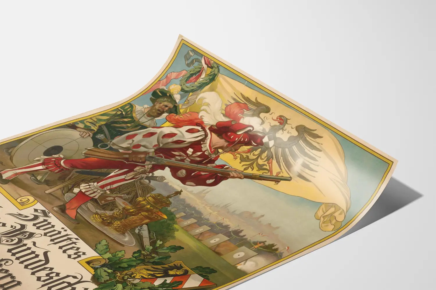 Denne gamle plakat forestiller det Tolfte Tyske Forbundsskyde, en skydningsevent organiseret i Nürnberg fra den 4. til den 11. juli 1897. Den viser en scene rig på historiske detaljer, med to mænd klædt i traditionelle kostumer og en af bueskytterne, der er ved at affyre med rifle, symbol på skydningskonkurrencen. I baggrunden kan man skimte et mål og et arkitektonisk landskab, hvor byens silhuetter træder frem under en klar himmel. Den gule banner med en sort ørn er et centralt element og giver plakaten en officiel og symbolsk karakter. Nederst fremhæves med gotisk skrift titlen på arrangementet, hvilket sikrer god læsbarhed og tilføjer et autentisk præg til det grafiske udtryk fra slutningen af det 19. århundrede. Denne vægdekoration er ideel for historieinteresserede, skydning eller ældre grafiske værker. Som plakat eller affisch bringer den en vintage og kulturel atmosfære ind i ethvert rum, hvad enten det er i en stue, et kontor eller et fritidsrum. Denne historiske plakat skiller sig ud med sine varme farver, fintarbejdede detaljer og sit typografiske udtryk, der udgør en perfekt balance mellem dekorativ kunst og begivenhedsvisning. Dette unikke vægdekoration inviterer dig til at dykke ned i den festlige og konkurrenceprægede stemning i Tyskland ved slutningen af det 19. århundrede.