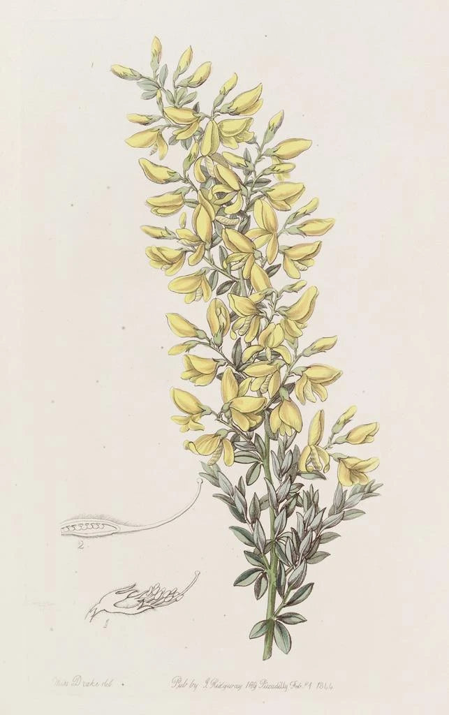 Kunsttrykket "Genêt branchu" af Sydenham Edwards er en sand fejring af den britiske flora. Med delikate strejf af gult og grønt fremkalder værket sollysets filtrering gennem bladene, hvilket skaber en rolig og beroligende atmosfære. Akvarelteknikken, mestret af kunstneren, gør det muligt at fange gennemsigtigheden og letheden af blomsterne, samtidig med at de fine detaljer i kronblade og stilke bringes til live. Dette kunsttryk inviterer betragteren til en blid, næsten meditativ eftertanke, hvor hvert element synes at vibrere i naturens rytme.