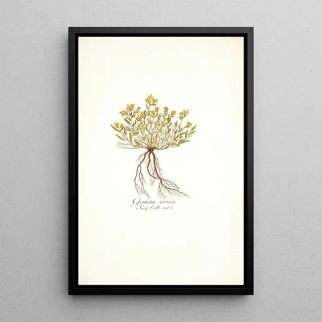 Den kunsttryk af Genista sericea tager os med på en rejse gennem en rig og fængslende blomsterverden. Dette værk af Nikolaus Joseph Freiherr von Jacquin afslører delikate blomster med gyldne nuancer, der blomstrer yndefuldt. Akvarelteknikken, mestret af kunstneren, giver hver enkelt element en lethed og flydende kvalitet, hvilket skaber en næsten drømmeagtig atmosfære. Værket inviterer til en fredelig eftertanke, hvor naturens skønhed fremhæves med bemærkelsesværdig følsomhed.