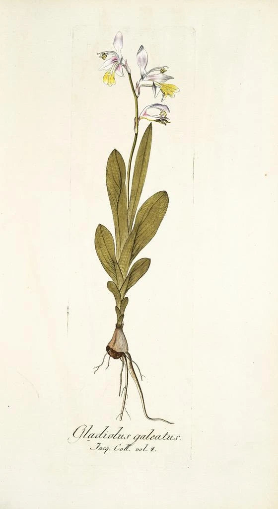 Nikolaus Joseph Freiherr von Jacquin, botaniker og kunstner fra det 18. århundrede, formåede at forene videnskab og kunst med stor dygtighed. Uddannet ved botanisk skole, rejste han gennem Europa og Caribien, inspireret af eksotiske landskaber og blomsterarter, han opdagede. Hans værk, Gladiolus galeatus, er skrevet ind i en periode, hvor den videnskabelige observation af planter var i fuld flor, og hans stil kendetegnes ved en bemærkelsesværdig præcision og opmærksomhed på detaljer. Jacquin har ikke blot bidraget til botanikken, men har også efterladt et kunstnerisk arv, der fortsat inspirerer blomster- og kunstelskere.
