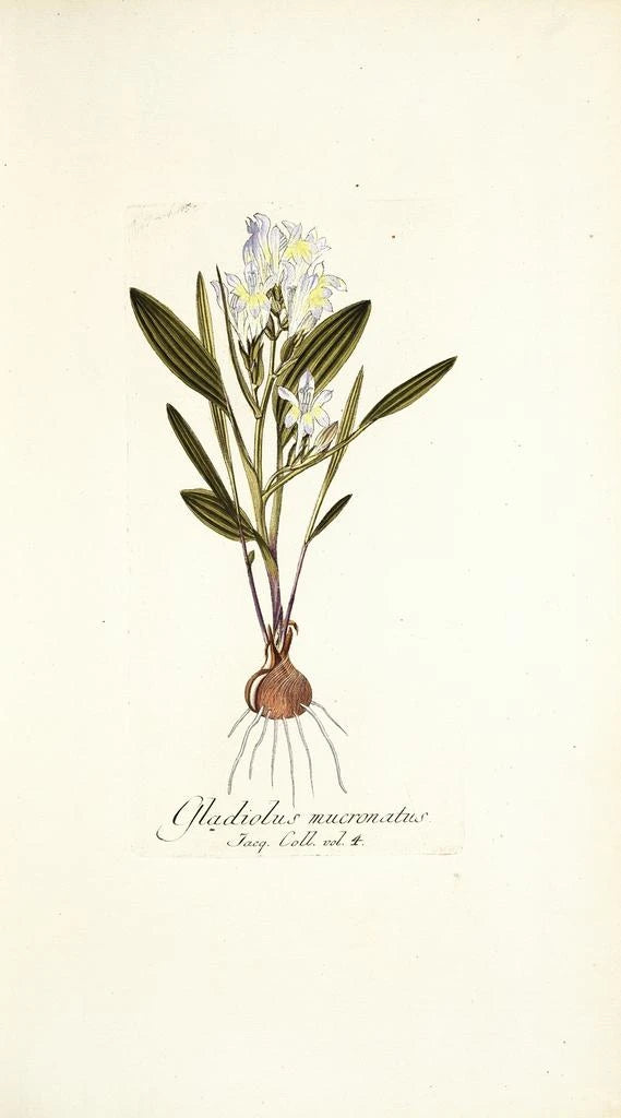 Nikolaus Joseph Freiherr von Jacquin, botaniker og kunstner fra det 18. århundrede, spillede en afgørende rolle i botanisk illustration. Uddannet i Wien, blev han påvirket af tidens videnskabelige opdagelser og af de opdagelsesrejser, der berigede viden om den globale flora. Hans værker, herunder Gladiolus mucronatus, vidner om en unik fusion mellem videnskab og kunst, hvor hver detalje er omhyggeligt observeret og gengivet. Jacquin bidrog til klassificeringen af planter og efterlader en varig arv inden for botanisk illustration, hvilket markerede en æra, hvor kunst også tjente til uddannelse.