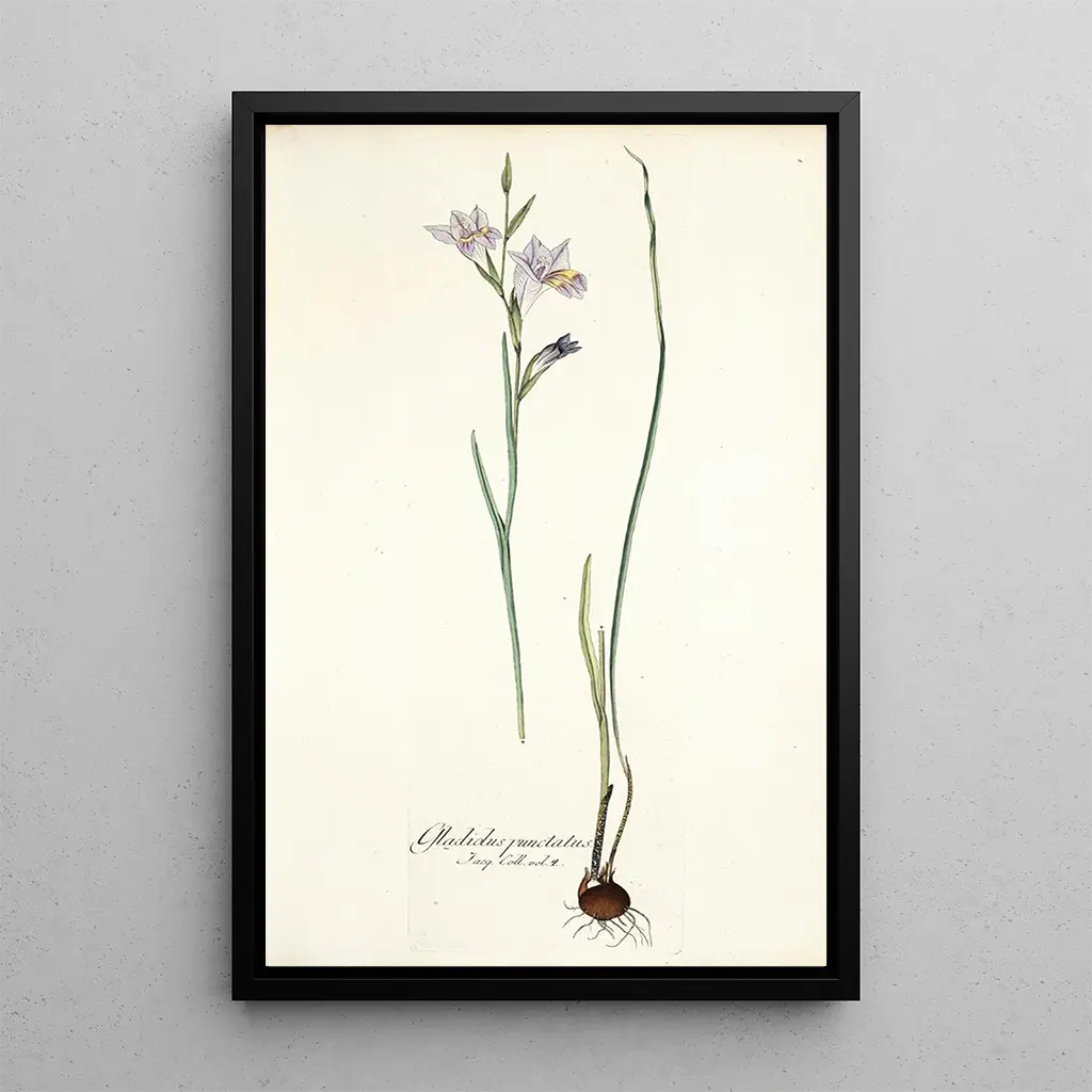 Reproduktionen af maleriet Gladiolus punctatus er en værdifuld tilføjelse til din indretning, uanset om det er i et arbejdsrum eller et afslapningshjørne. Dets trykkvalitet sikrer en bemærkelsesværdig trofasthed over for farver og detaljer i det originale værk, hvilket tilføjer et strejf af elegance til dit miljø. Ved at vælge dette lærred giver du dit rum en blomsteragtig note, der vil charme dine besøgende og skabe en rolig og inspirerende atmosfære. Dette maleri er meget mere end blot en dekoration, det er en fejring af den naturlige skønhed inden for rækkevidde.