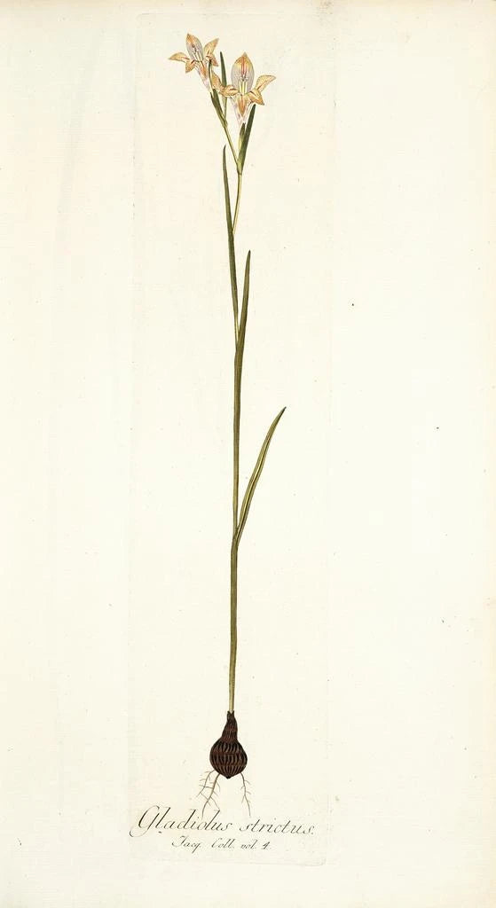 Nikolaus Joseph Freiherr von Jacquin, botaniker og kunstner fra det 18. århundrede, formåede at forene sine passioner for videnskab og kunst. Uddannet ved Wiens universitet, blev han påvirket af de botaniske fremskridt i sin tid, især opdagelserne af nye landområder. Hans kunsttryk, Gladiolus strictus, illustrerer ikke kun hans tekniske kunnen, men også hans engagement i at dokumentere den botaniske mangfoldighed. Som medlem af Videnskabsakademiet har han efterladt et varigt aftryk på botanisk illustration, hvor præcision og kunstnerisk følsomhed går hånd i hånd, hvilket gør hans værker til referencer inden for feltet.