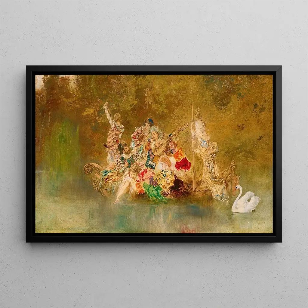 La toile "Joyeuse compagnie dans une gondole" d'Anton Romako évoque une scène vibrante de la vie vénitienne, où des personnages élégamment vêtus se laissent porter par les flots. Les couleurs chaudes et lumineuses, mêlant des nuances de bleu et d'or, créent une atmosphère festive et joyeuse. La technique de Romako, qui allie le réalisme à une touche impressionniste, permet de capturer non seulement les détails des costumes mais aussi l'essence même de la convivialité. Les reflets dans l'eau ajoutent une dimension presque magique, invitant le spectateur à plonger dans cette scène de bonheur partagé.