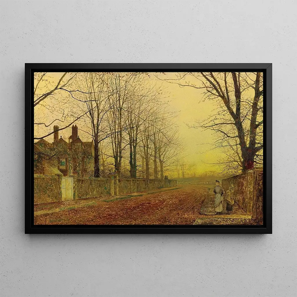 Kunsttrykket Gloire d'automne af John Atkinson Grimshaw tager os med til et efterårslandskab fyldt med melankoli og skønhed. De gyldne og orange nuancer på bladene, oplyst af et blødt lys, skaber en næsten magisk atmosfære. Grimshaw, mester i clair-obscur, bruger slående kontraster til at fremhæve dybden og teksturen i naturen. De fine detaljer i træerne og stierne fremkalder en følelse af ro og fred, mens himlen, tonet i pastelnuancer, tilføjer en poetisk dimension til scenen. Dette værk er en ægte fejring af sæsonen, der fanger den flygtige skønhed i efteråret.