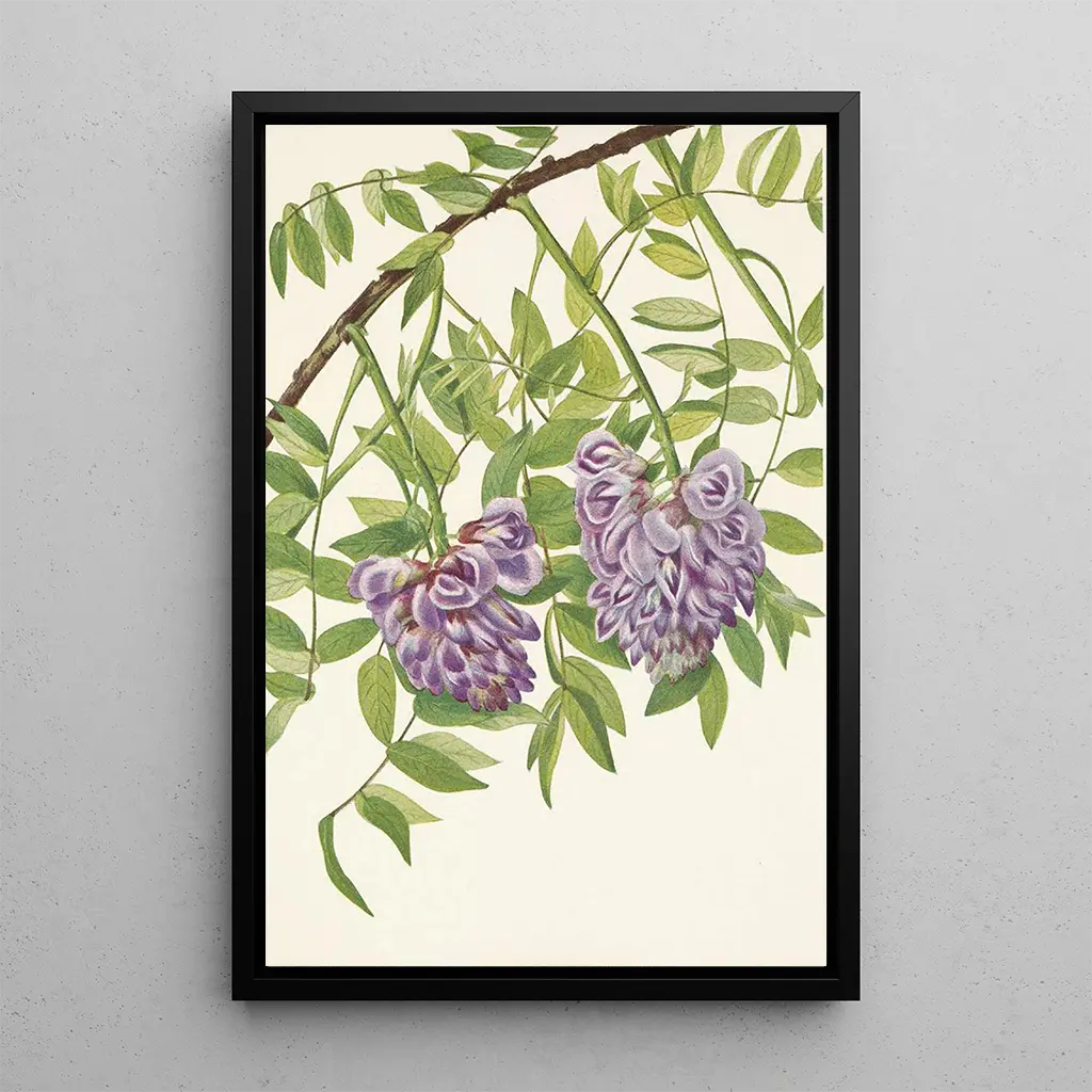 Den kunsttryk af Glycine amerikansk Kraunhia frutescens af Mary Vaux Walcott tager os med ind i en verden af delikatesse og naturlig skønhed. De bløde nuancer af violet og blå blander sig harmonisk, hvilket skaber en beroligende atmosfære. Akvarelteknikken, anvendt med finesse, fremhæver detaljerne i blomsterne og bladene, og indfanger essensen af denne klatreplante. Hvert penselstrøg synes at ånde liv, og inviterer betragteren til at dykke ned i en frodig have, hvor tiden står stille for at værdsætte naturens storhed.