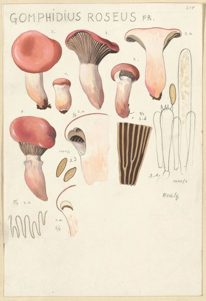 I dette fascinerende værk dykker Hans Baldung ned i den mystiske verden af svampe med sin fremstilling af Gomphide rose. De delikate nuancer af rosa og beige blander sig harmonisk, hvilket skaber en atmosfære, der er både blid og gådefuld. Baldungs teknik, kendetegnet ved omhyggelige detaljer og subtil belysning, fremhæver den unikke tekstur af dette svampe. Værket inviterer betragteren til at beundre naturens flygtige skønhed, samtidig med at det vækker nysgerrighed for de hemmeligheder, den planteverden rummer.