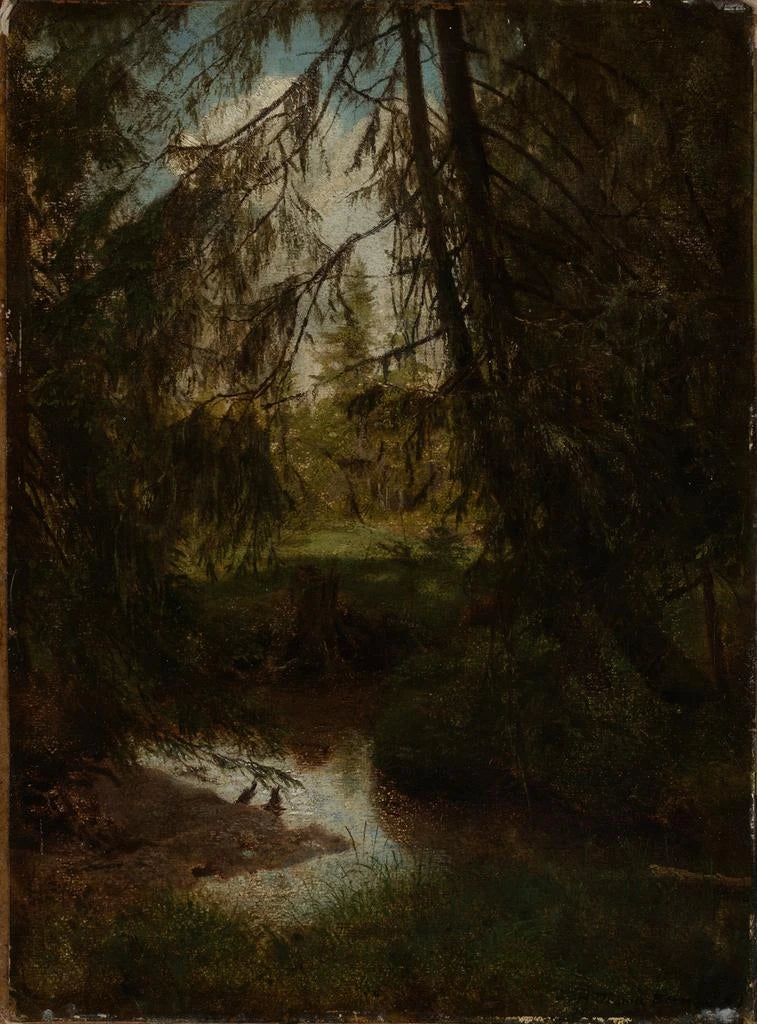 Grantræer ved bredden af skovbækken - Hans Thoma